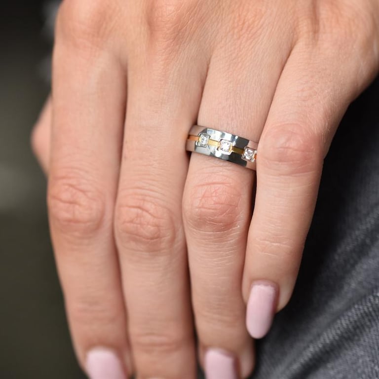 • in der Mitte umläuft den Ring ein andersfarbiger Goldstreifen und im kleineren Ring sitzen dort drei eckig gefasste Diamanten