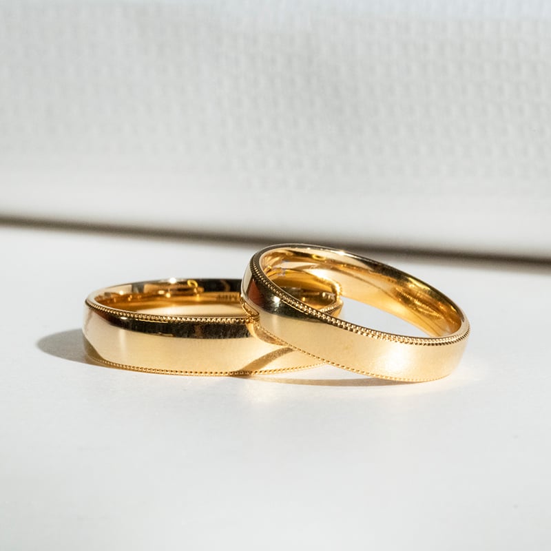 Goldene Eheringe mit einem verzierten Rand Rayan