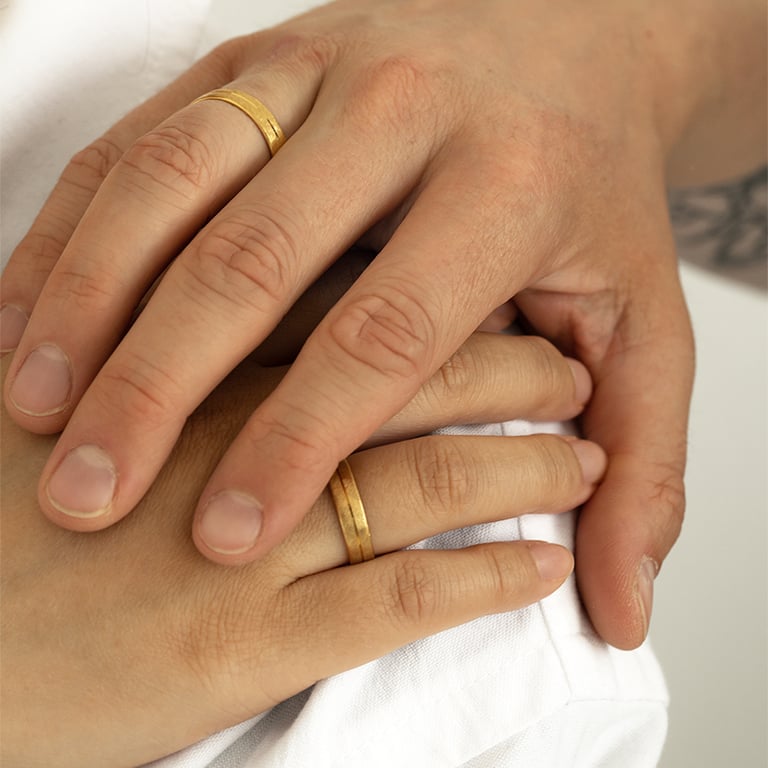 • ein ungewöhnliches Paar Eheringe, dessen strukturierte Oberfläche durch Kratzen entstanden ist