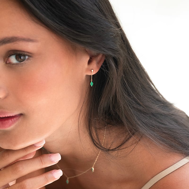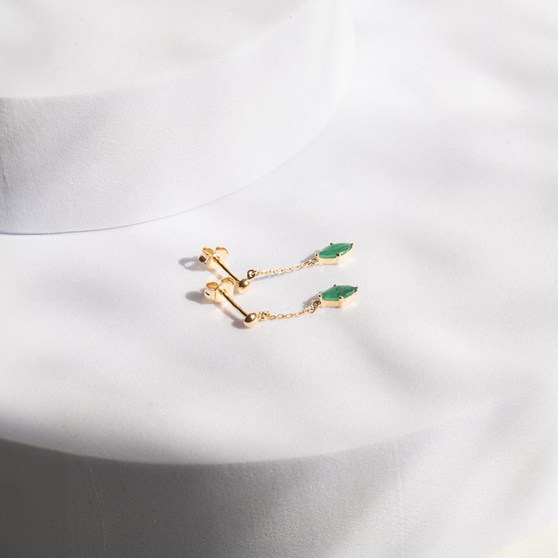• eine kleine Kette am Ohrstecker mit einem natürlichen Smaragd am Ende