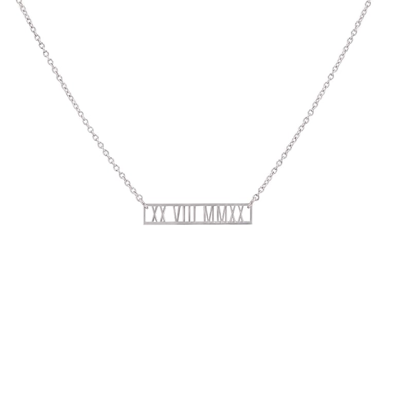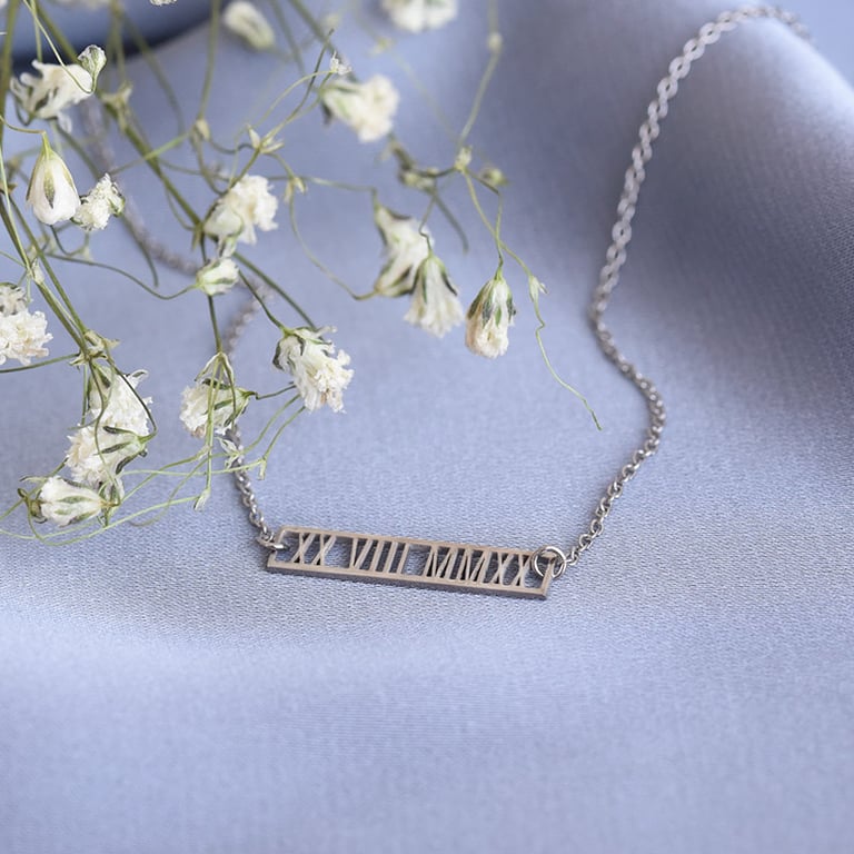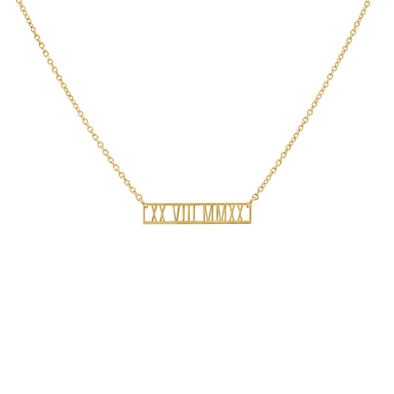 • eine minimalistische Goldkette mit römischen Datumsangaben und möglichen Personalisierung