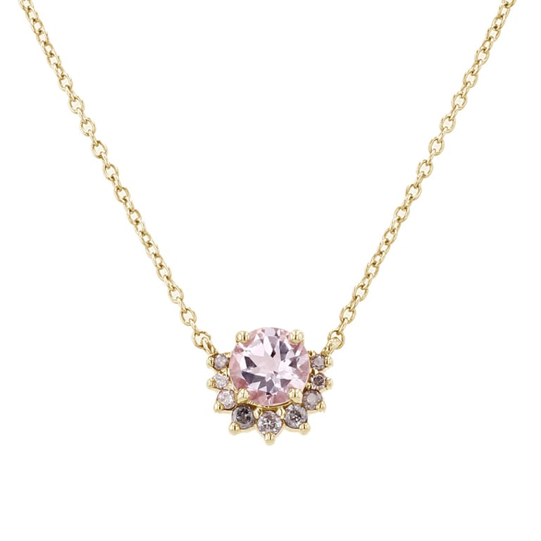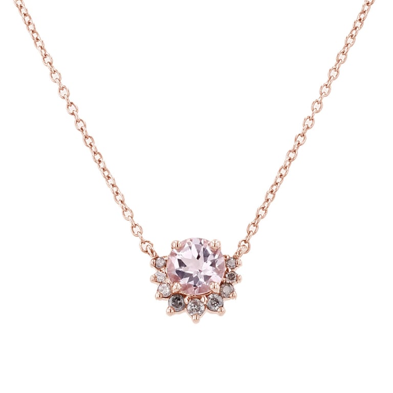 • der pfirsichfarbene Morganit dominiert den Anhänger und er wird von 9 Salt und Pepper Diamanten umrahmt