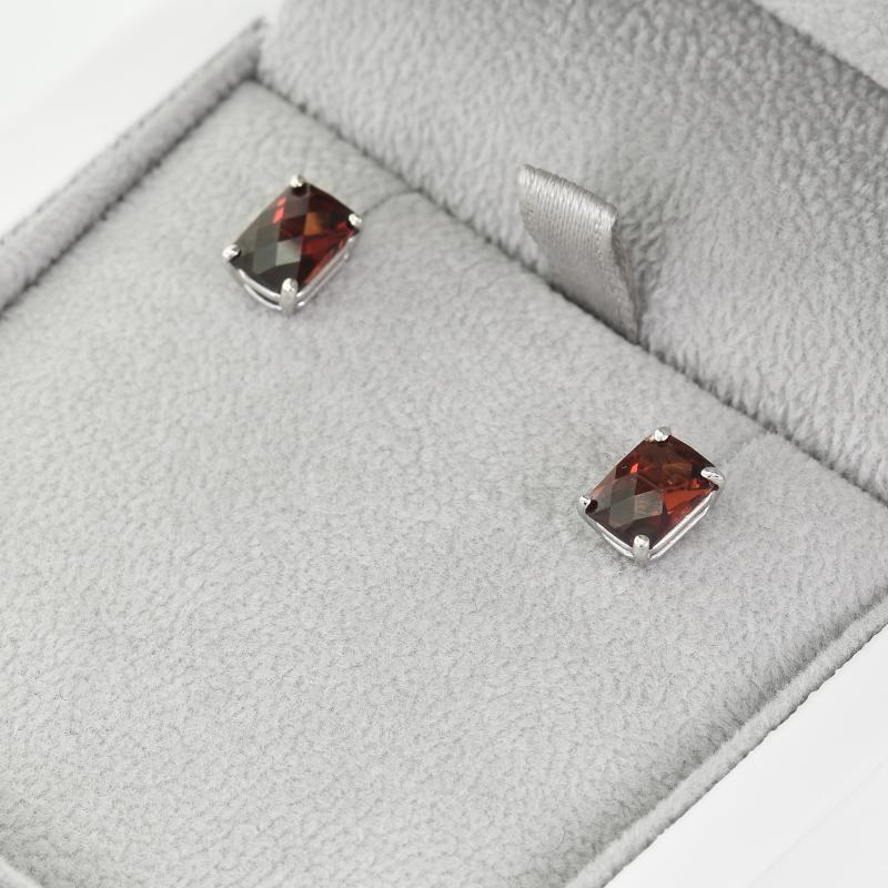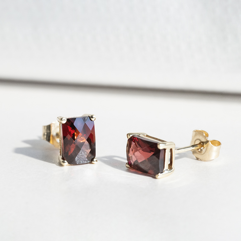 • in diesen Goldohrsteckern sind natürliche, blutrote Granate im Radiantschliff verarbeitet
