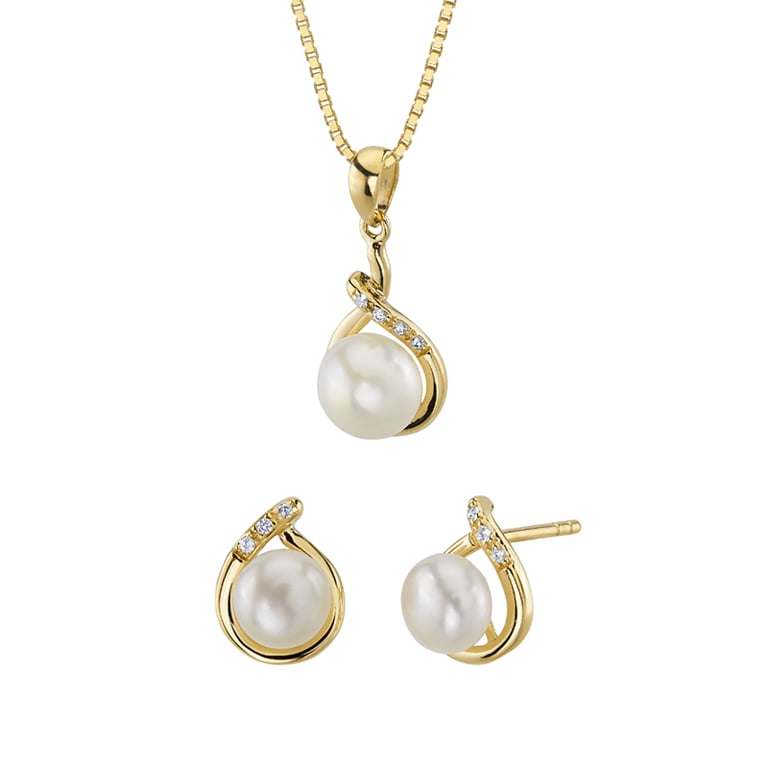 • bei diesem eleganten und leicht romantischen Set schweben Perlen in einem angedeuteten Blatt aus Gold und Zirkonen