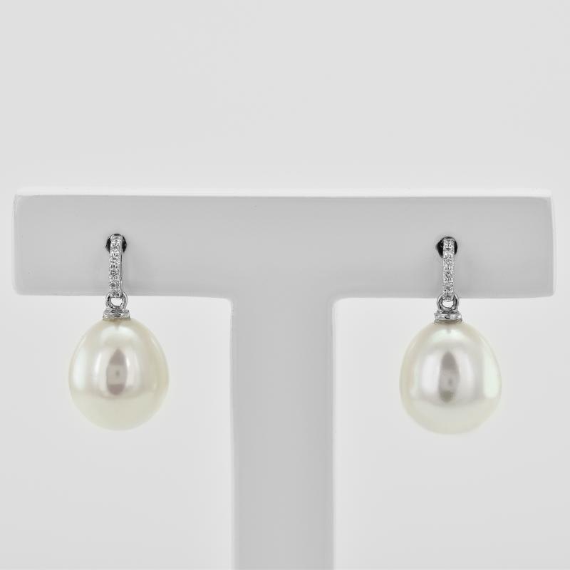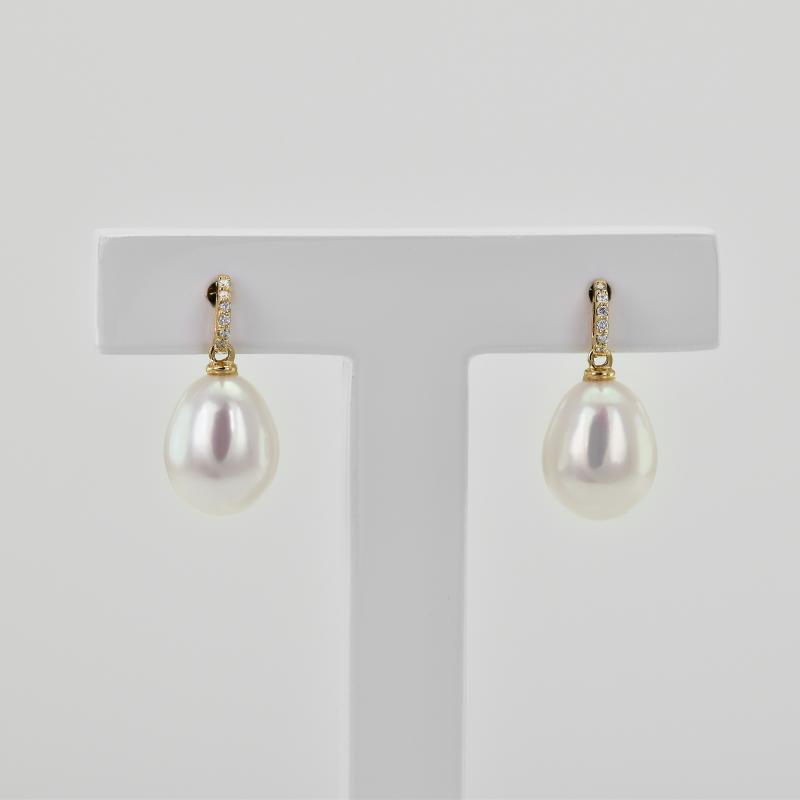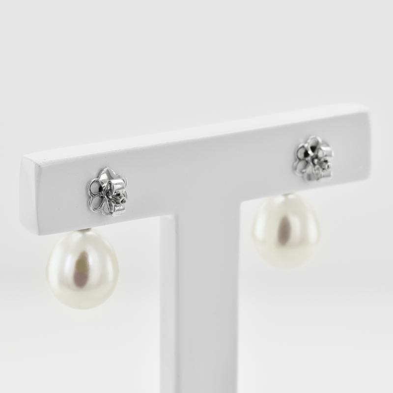 • weiße, 9-9.5 mm große ovale Perlen mit einem leichten rosa Schimmer werden von einem mit diamantenbesetzten Band gehaten