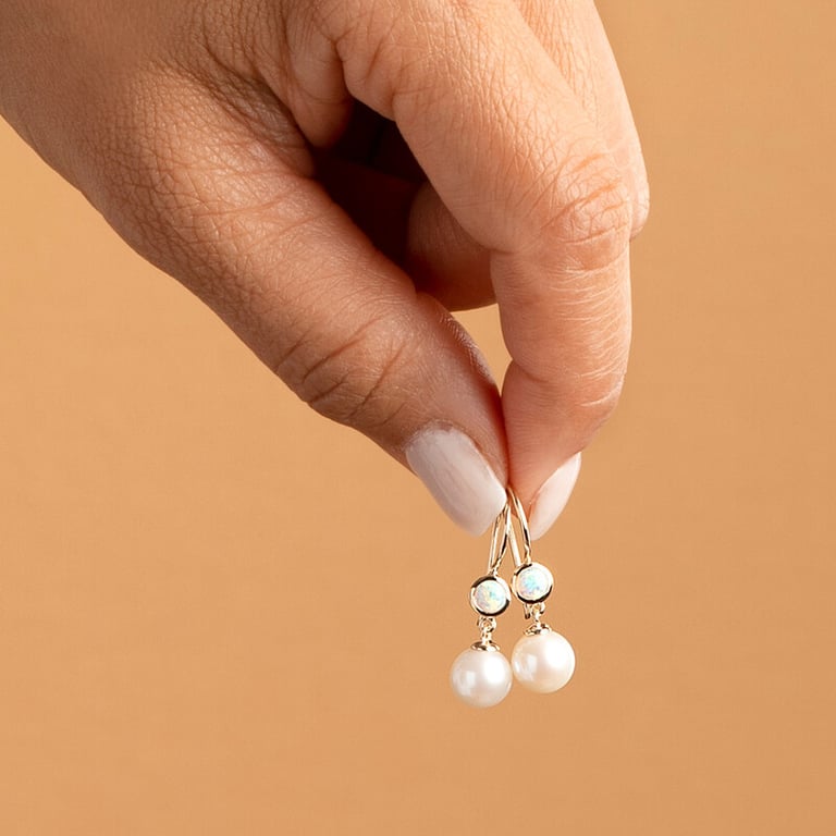 • Ohrringe aus 585er Gold mit Süßwasserperle und im Labor hergestelltem Opal