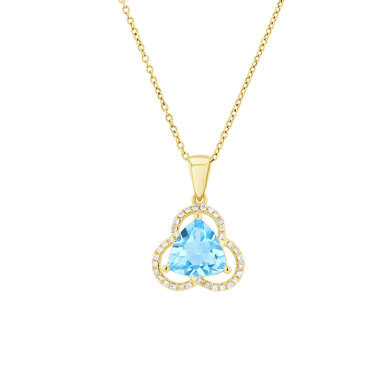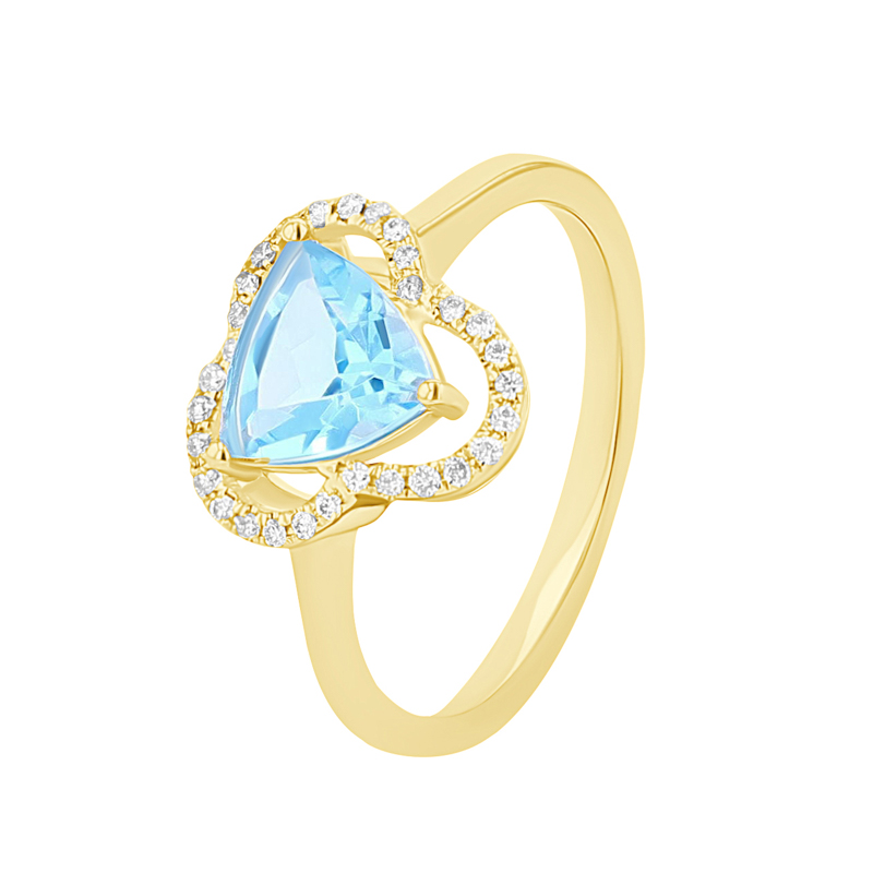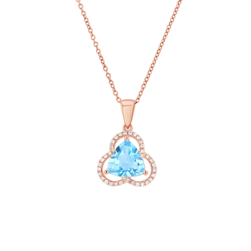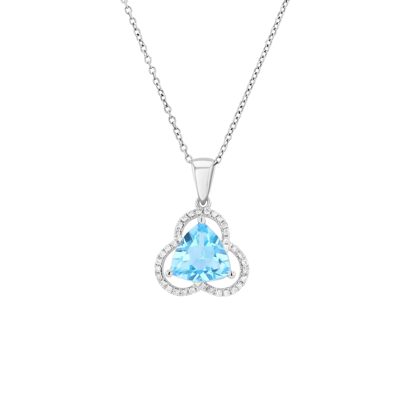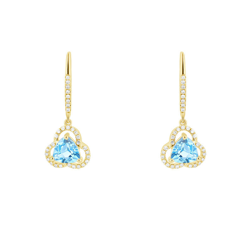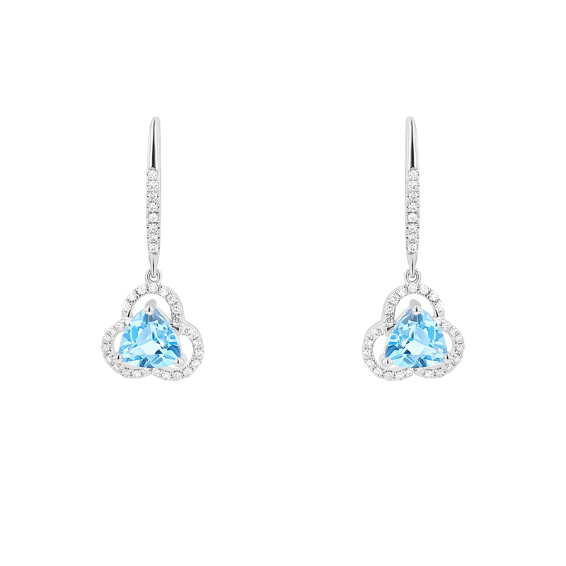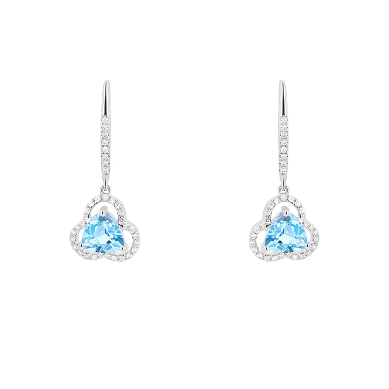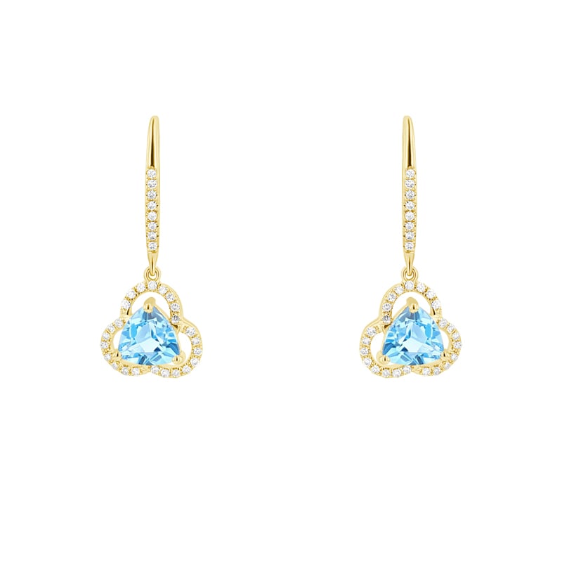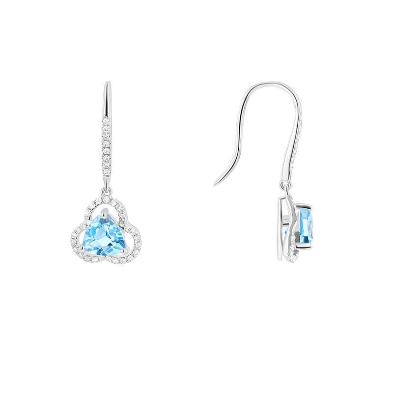 • himmelblaue dreieckige Topase im Trillion-Schliff werden von Diamanten umgeben