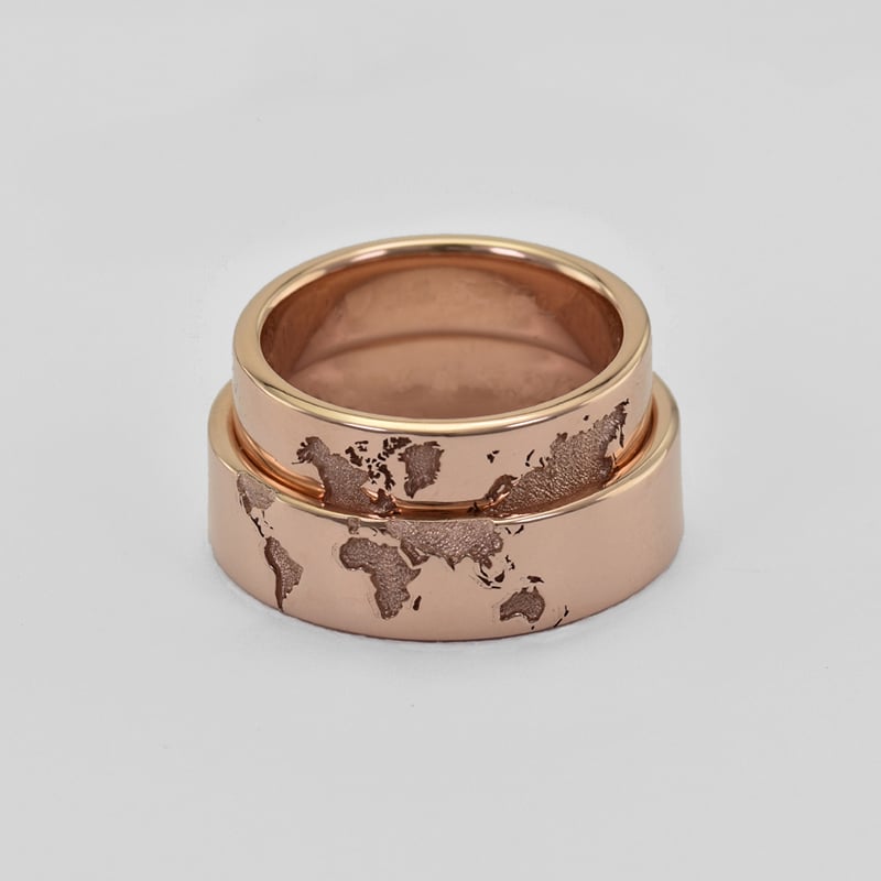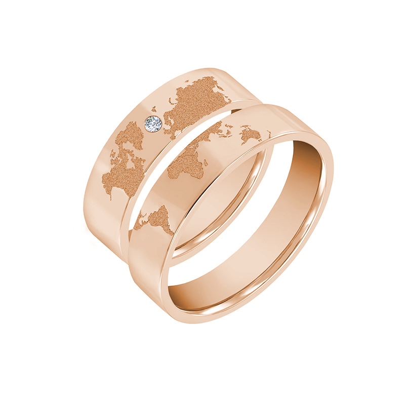 • beide Eheringe sind mit einer Gravur der Welt versehen und der Diamant-Ehering ist für die Dame