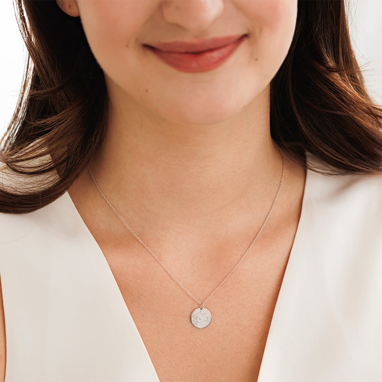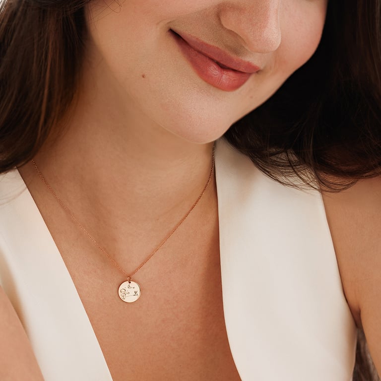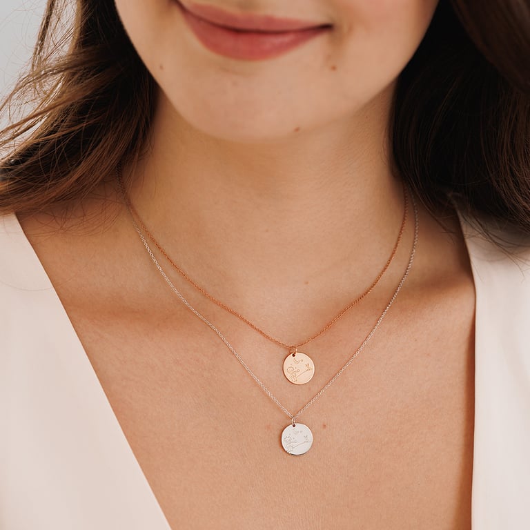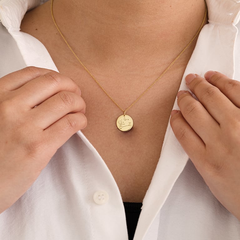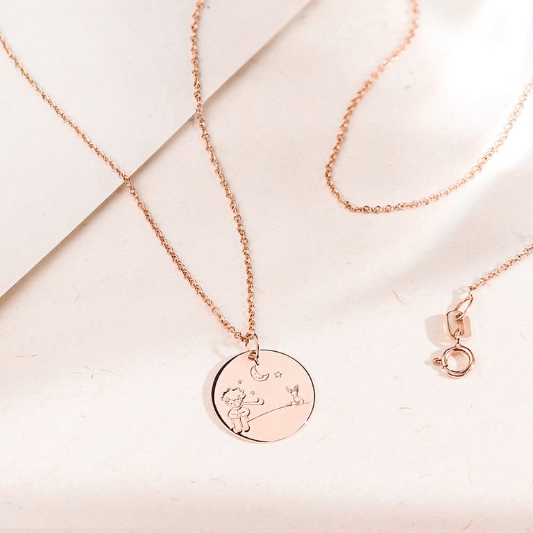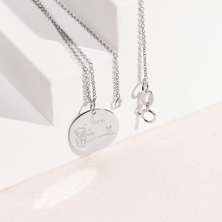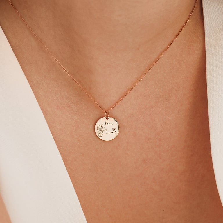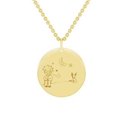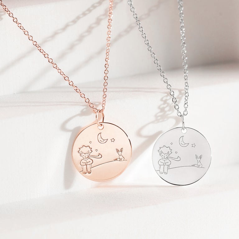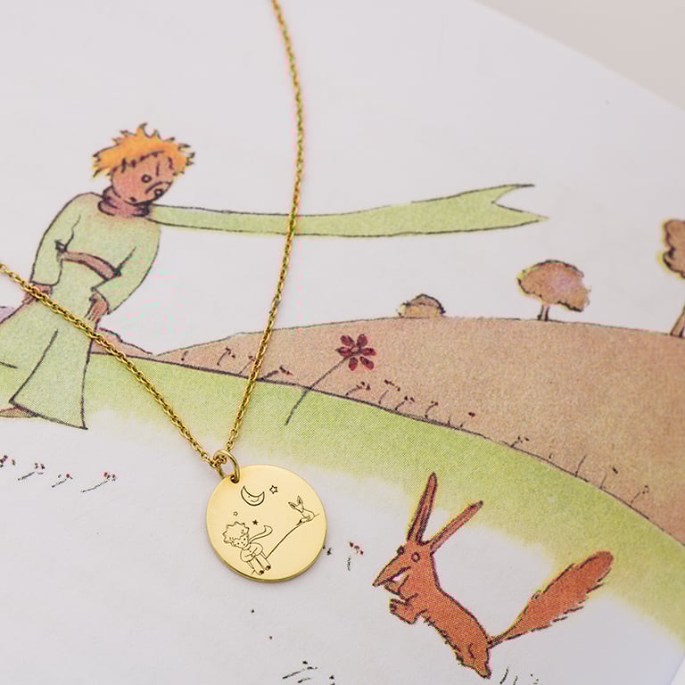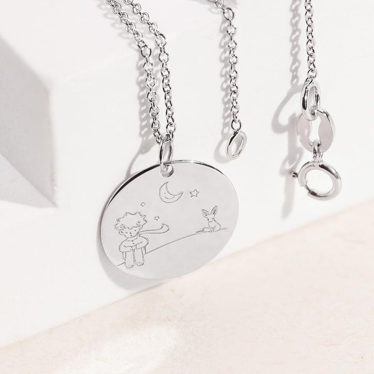 • ein zarter Anhänger verziert mit einer präzisen Gravur des Kleinen Prinzen und des Fuchses