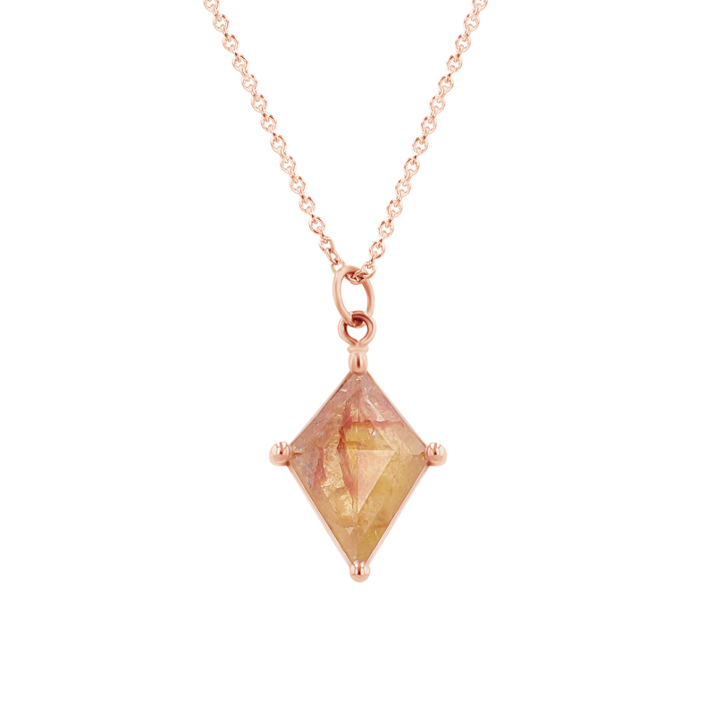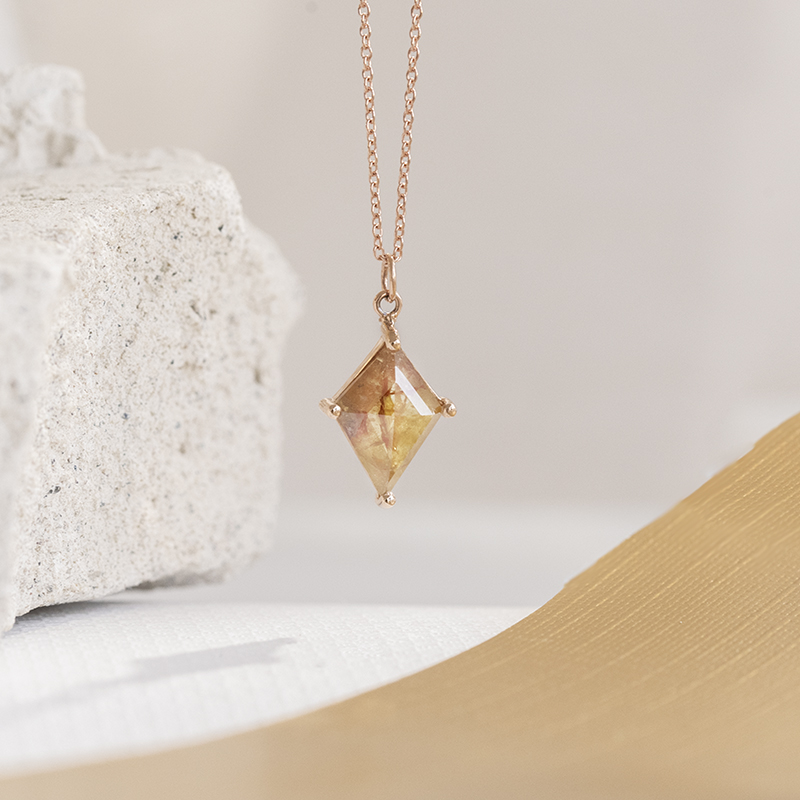 • ein geheimnisvoller Salt and Pepper Diamant in Kite Form in einem Anhänger aus recyceltem Roségold