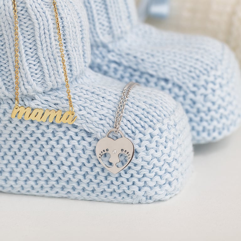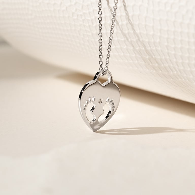 • der herzförmige Goldanhänger mit Kinderfüßchen und mit einem Diamanten, kann nach Wunsch graviert werden