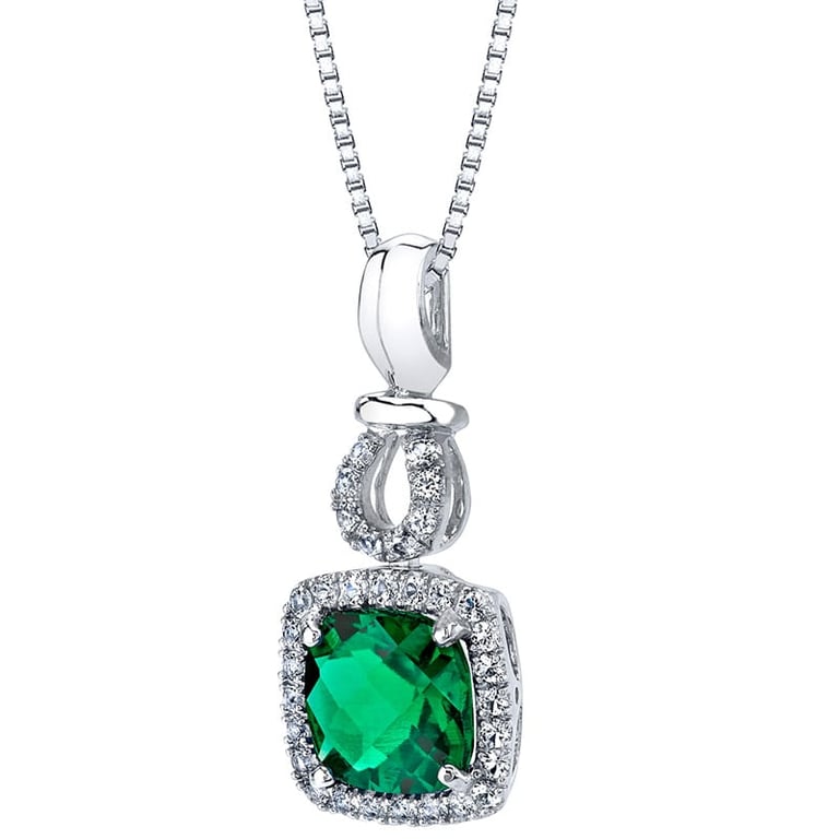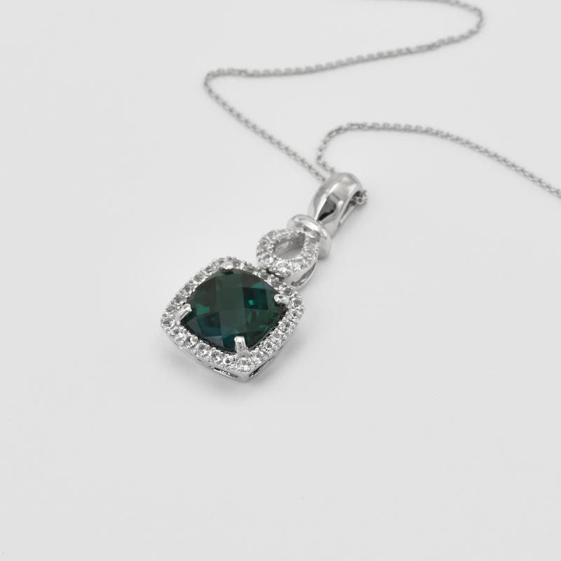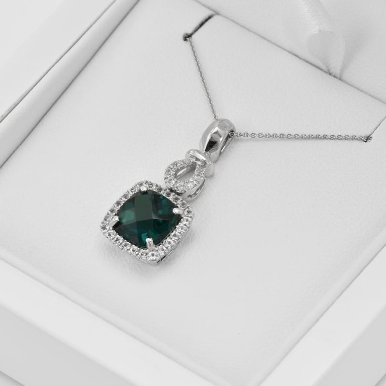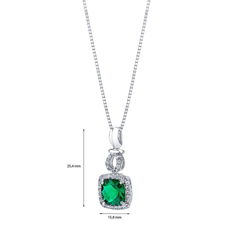 • Kette und Anhänger sind in Weißgold, der quadratische Smaragd ist von einem Halo aus weißen Topasen umgeben