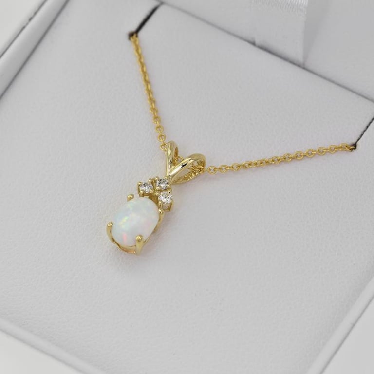 • dieser Goldanhänger hat einen ovalen Opalcabochon im Mittelpunkt, der mit Diamanten verziert ist