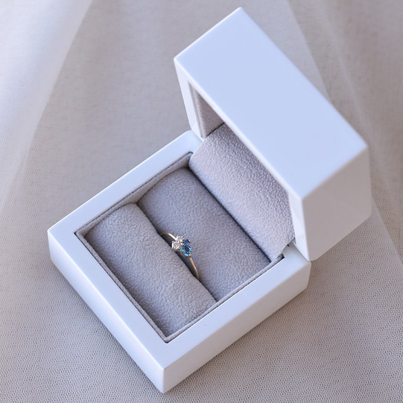 • die blauen Reflexionen des Topases und des Saphirs, die durch das Strahlen des Moissanits ergänzt sind, verzaubern Sie und Ihre Auserwählte