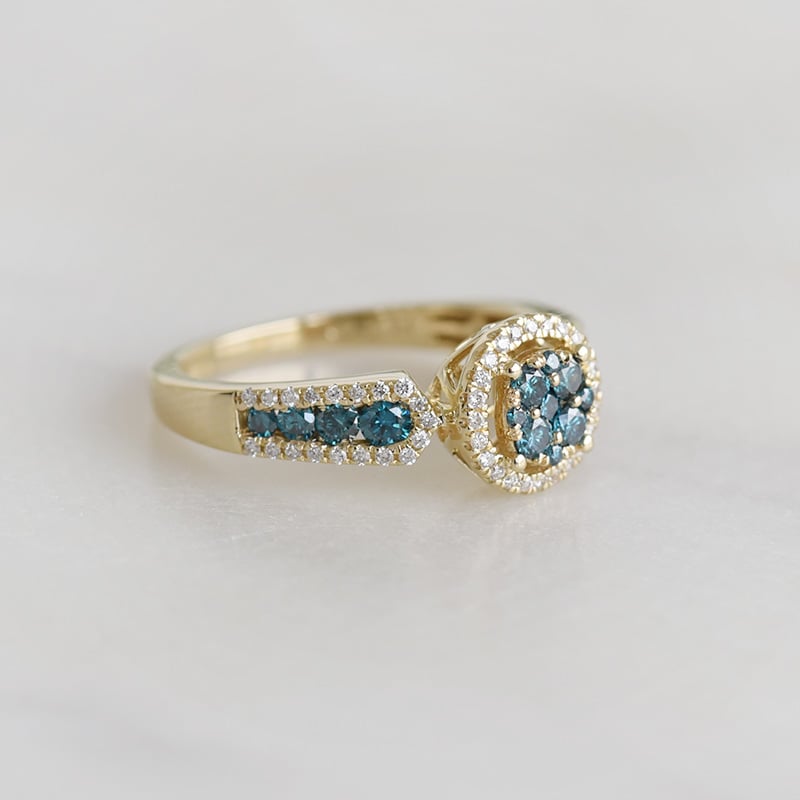 • die goldene Ringschiene ist mit funkelnden Diamanten in blauer Farbe besetzt