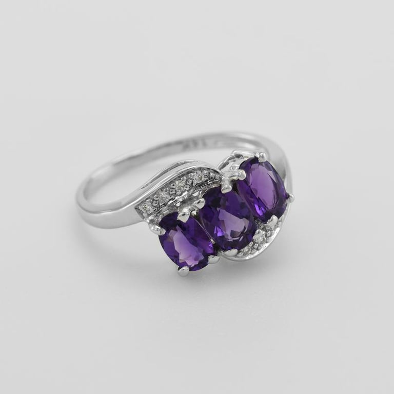 • drei oval geschliffene Amethyste in tiefem Violett werden von etlichen Seitendiamanten ergänzt