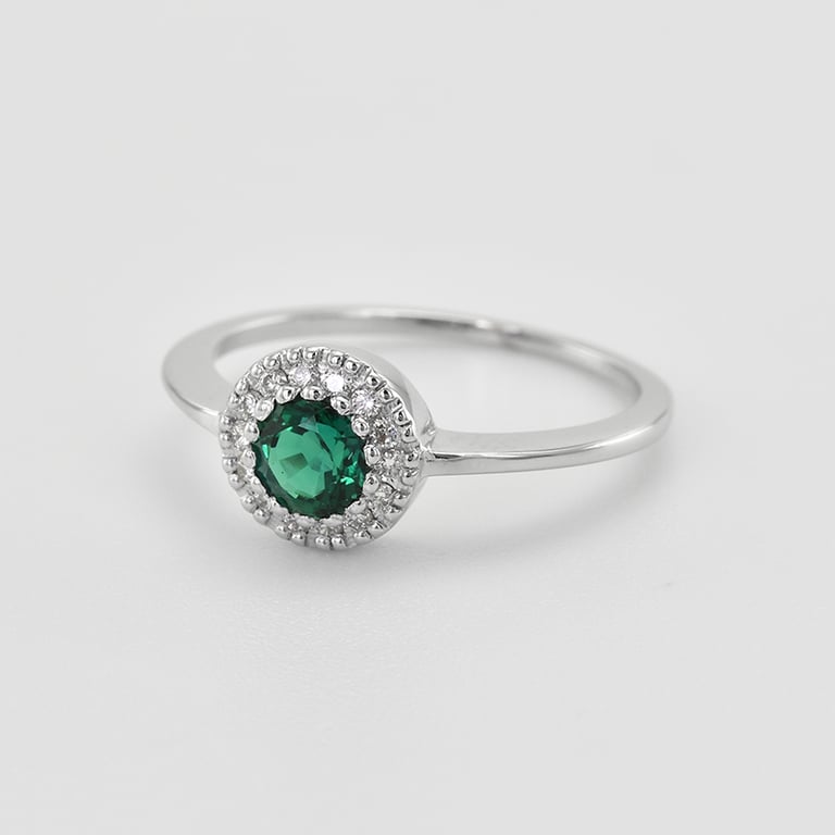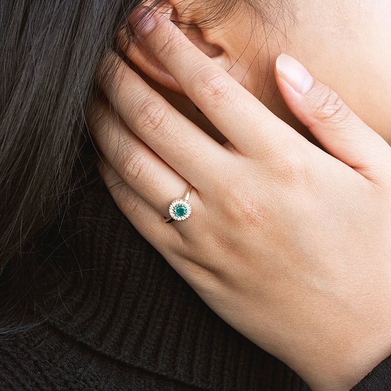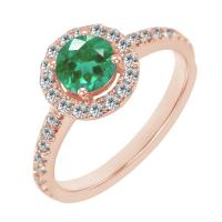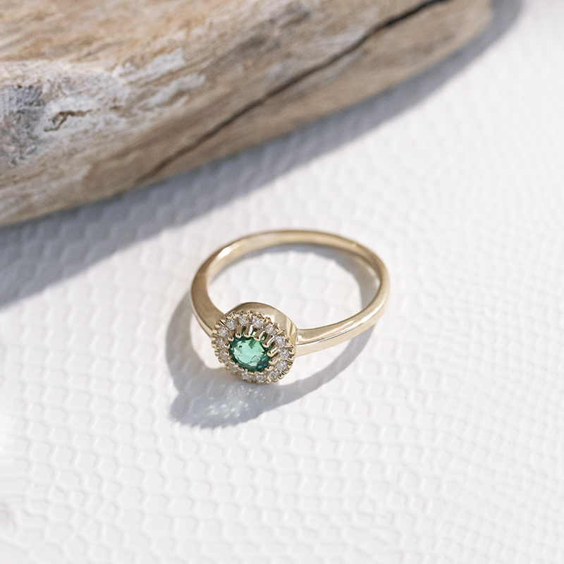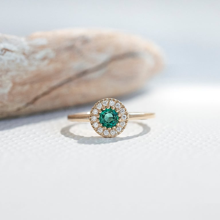 Goldener Halo Ring mit Smaragd umgeben von Diamanten Tafne
