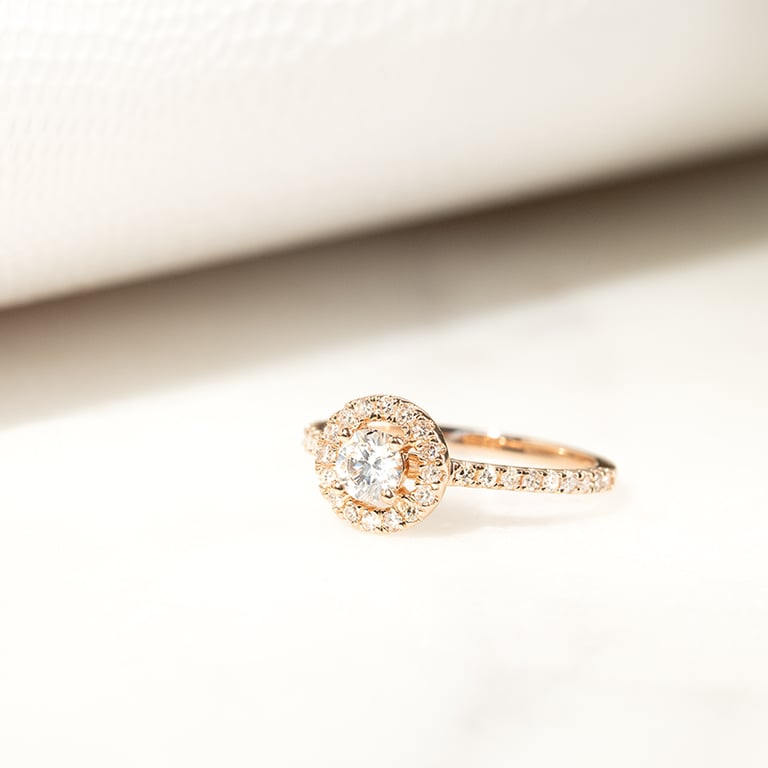 • dank der Halo-Fassung wirkt der zentrale Diamant größer und strahlender