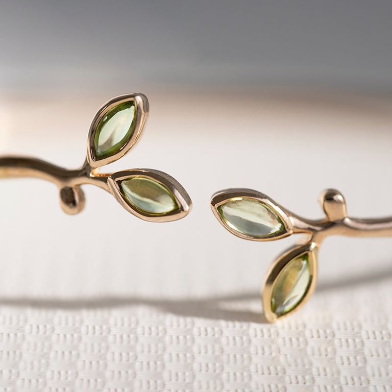 • das zarte Design wird durch vier Olivine in Cabochon-Form auf den Blättern aufgelockert