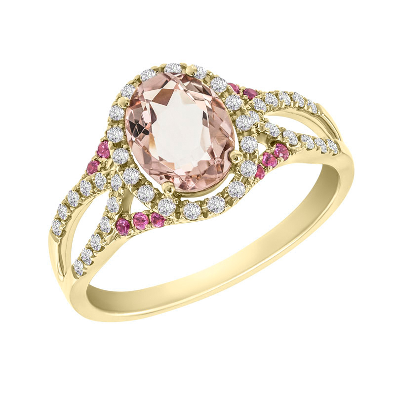 • bei diesem Ring in Roségold wird ein ovaler Morganit von einem diamantenbesetzten Halo umgeben