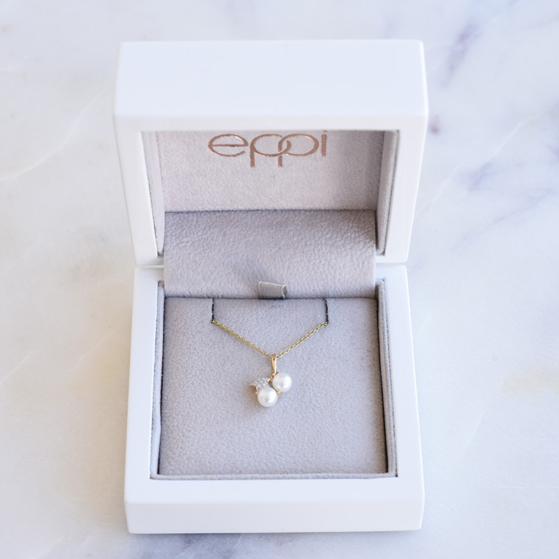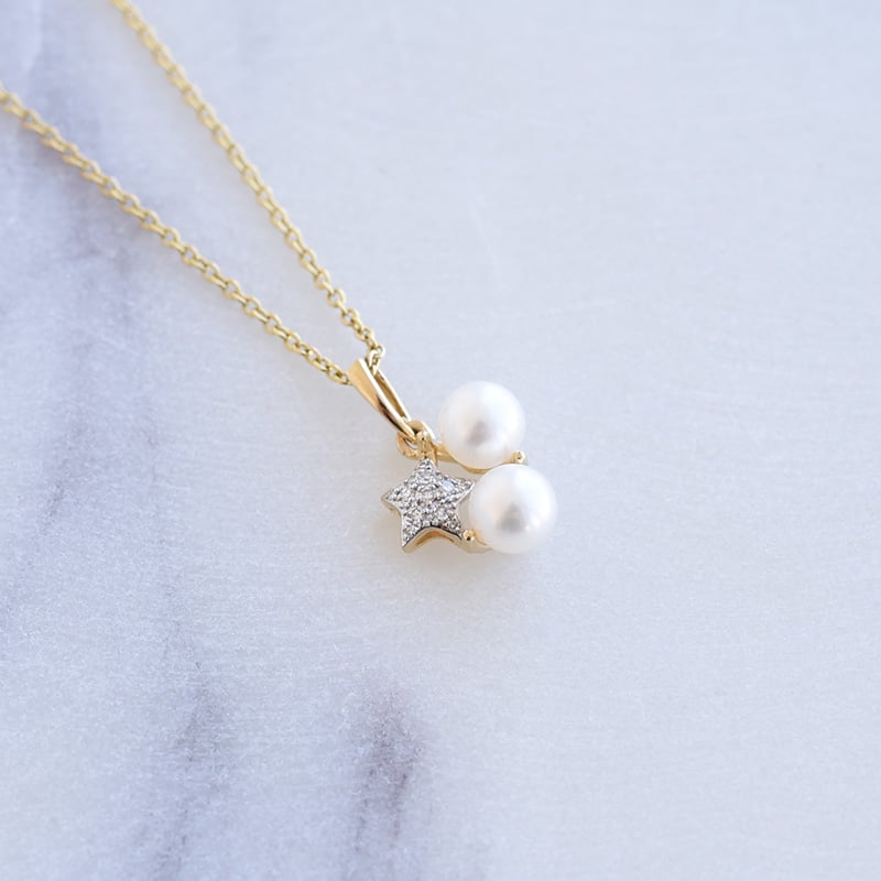 • das Duo von Perlen wird von elf Diamanten begleitet, die in Form eines Sterns eingesetzt sind
