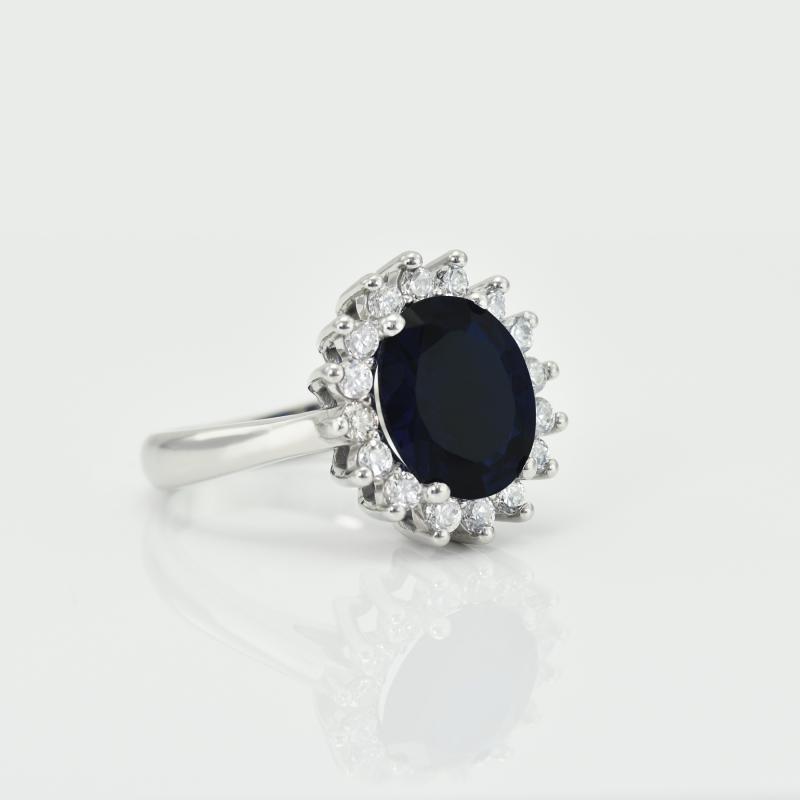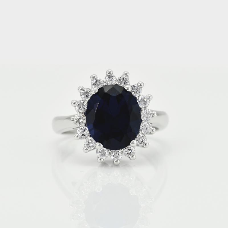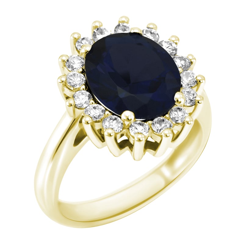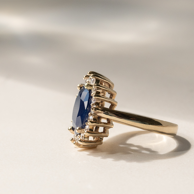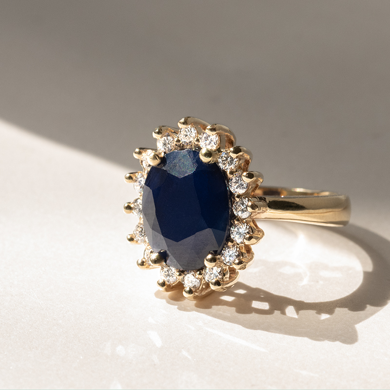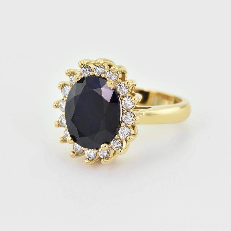 • der Goldring hat einen ausdrucksvollen, tiefblauen Saphir im Zentrum, umgeben von einem Ring aus Diamanten