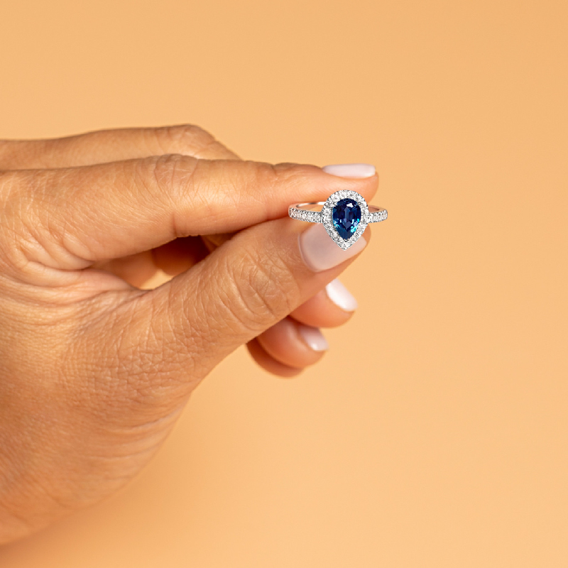 • dank der Fassung mit weißen Lab Grown Diamanten im Halo-Stil kommen seine schönen blau-violetten Reflexe besonders gut zur Geltung