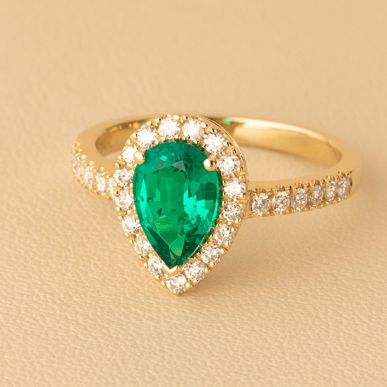 • ein atemberaubender Ring aus Gelb- oder Weißgold mit einem tropfenförmigen Smaragd, der Sie zweifellos zum Strahlen bringen wird