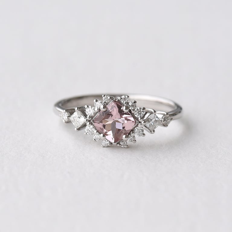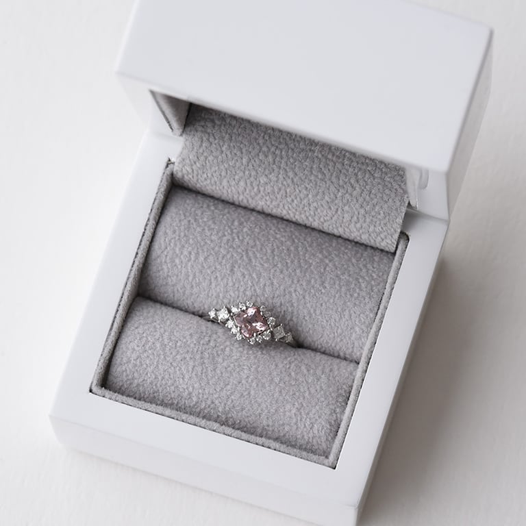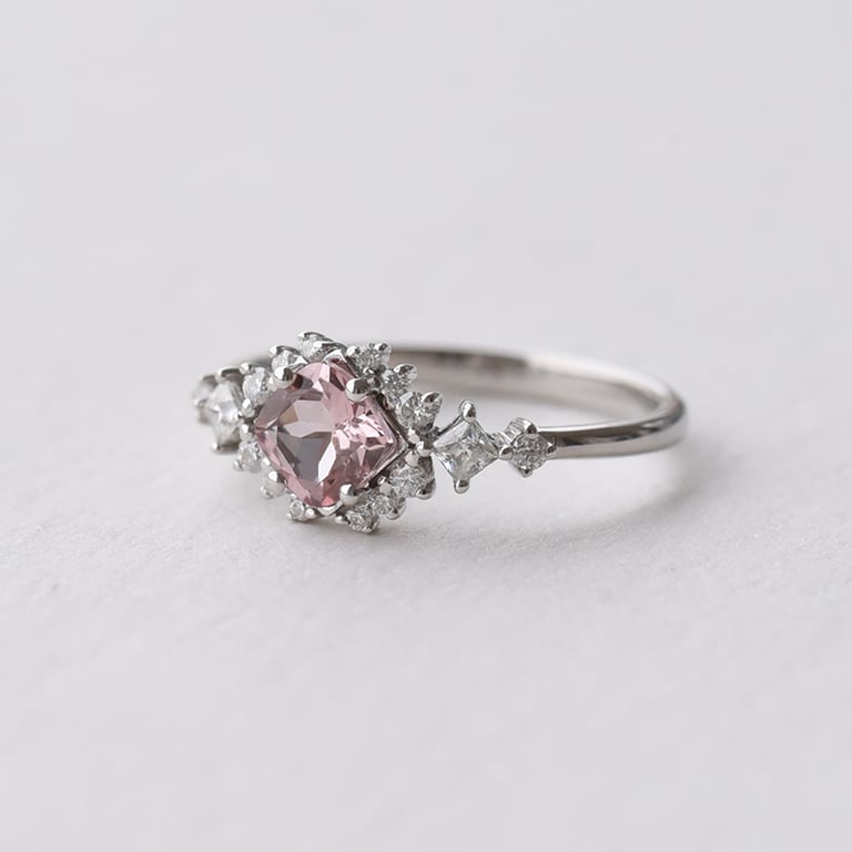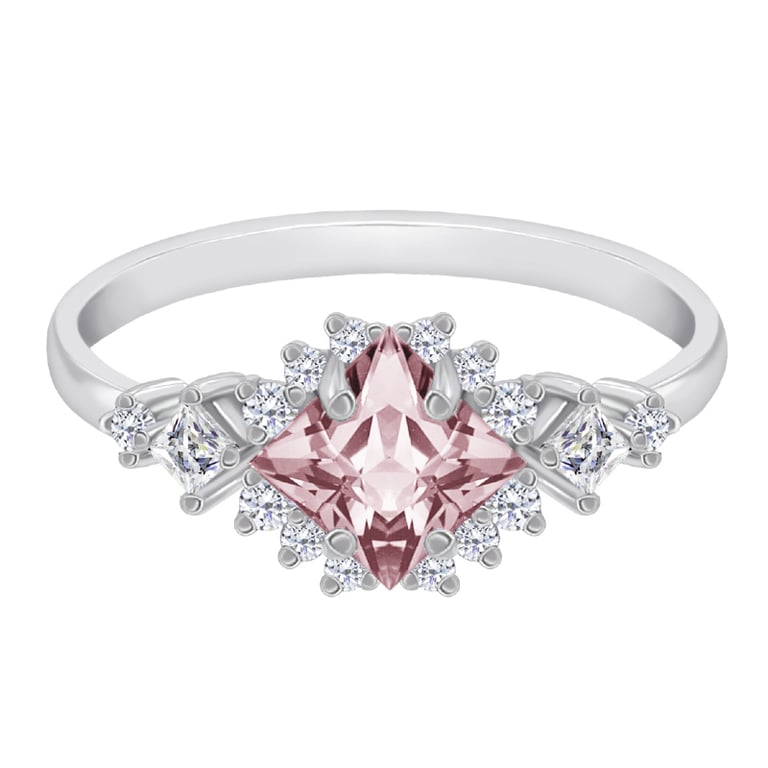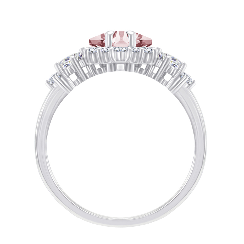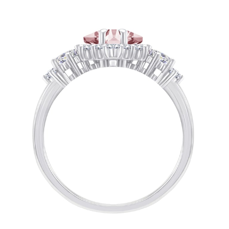 • ein eleganter Verlobungsring, besetzt mit Morganit und glänzenden Moissaniten