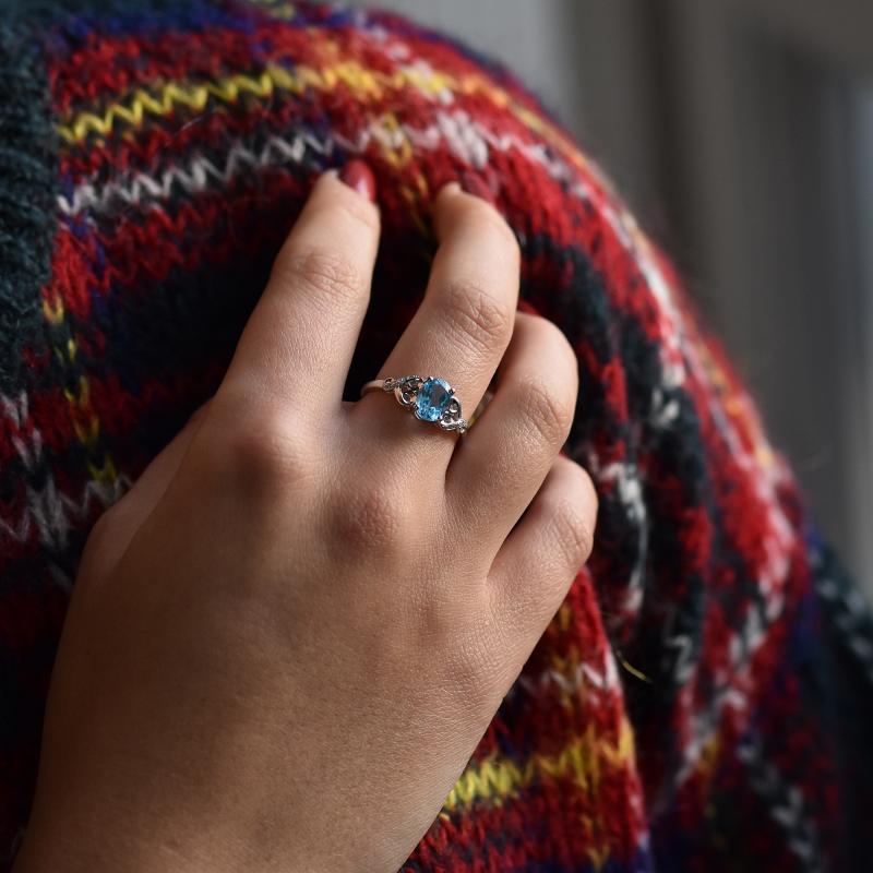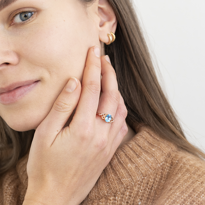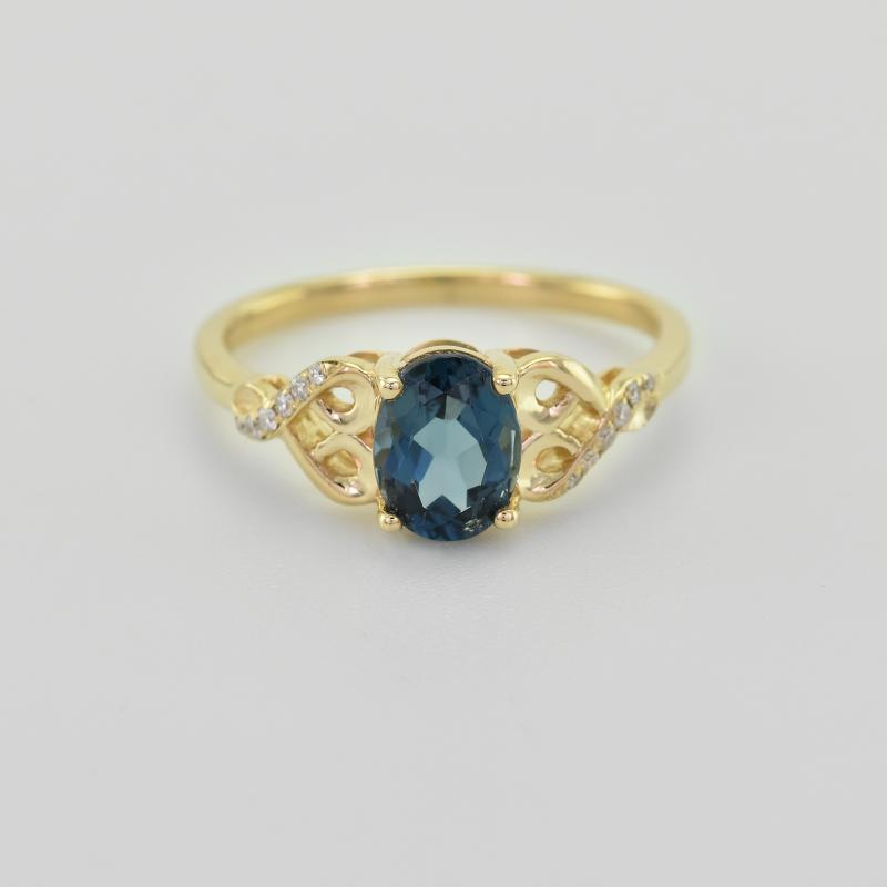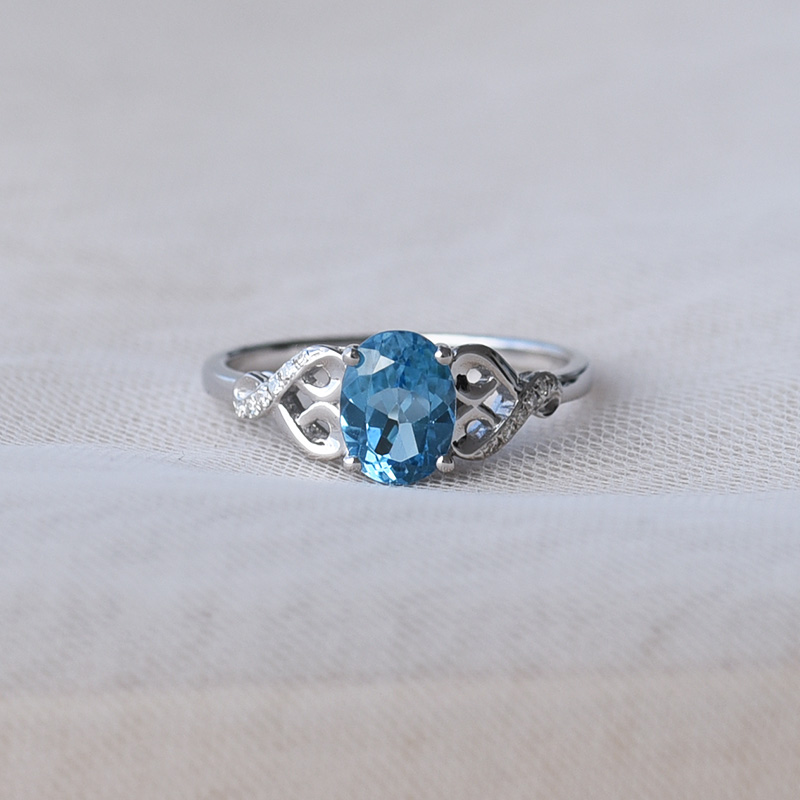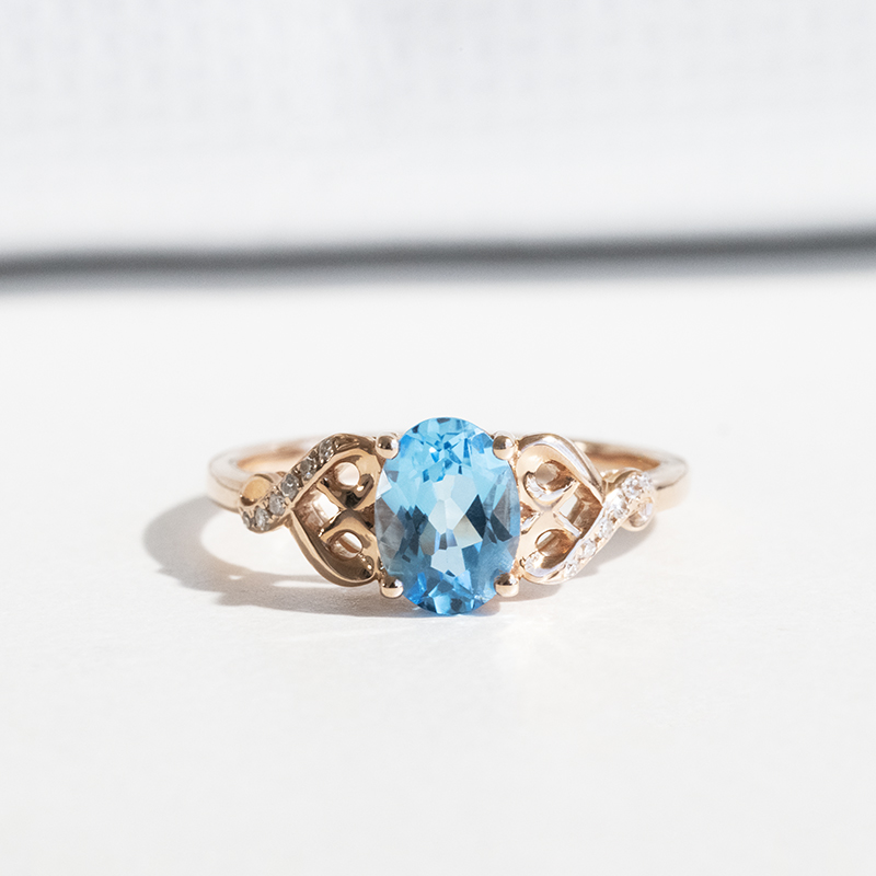 • der ovale blaue Topas wird von zwei Herzen auf der gewundenen Ringschiene umgeben und die jeweils andere Herzhälfte ist diamantenbesetzt