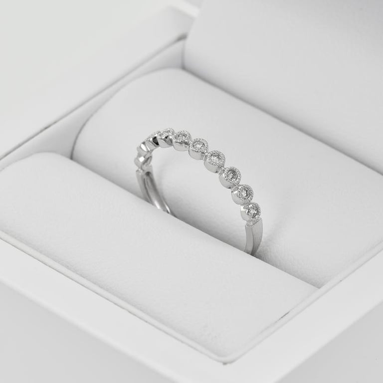 • außergewöhnliche Eheringe mit einem flachen Ring und einem zarten Vintage-Ring mit weißen, rund gefassten Diamanten