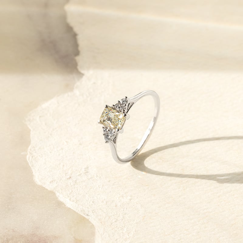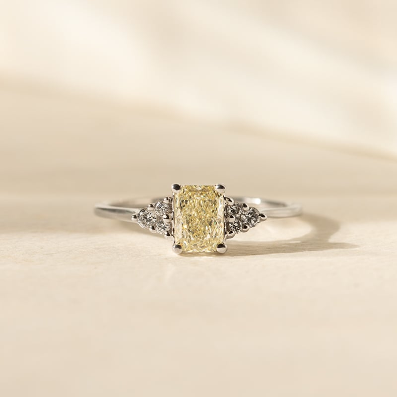 • der zentrale Stein in Form eines GIA-zertifizierten Diamanten in Emerald Form besticht durch seinen sanften gelben Farbton
