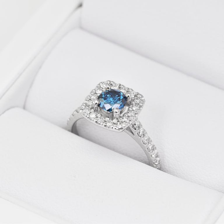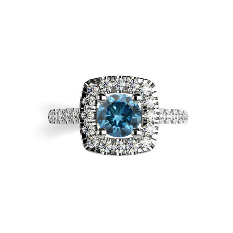 • der Haloring in Weißgold mit einem zentralen blauen Diamanten ist eine solche besondere Verbindung