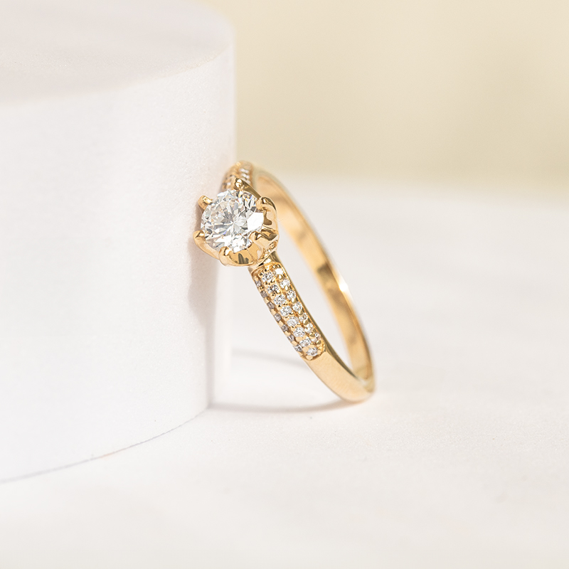 • die Ringschiene ist mit Diamanten besetzt, die den zentralen Diamanten zusätzlich betonen