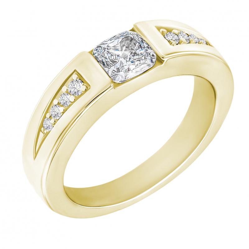 • ein Diamant im Kissenschliff ist hier in eine Ringschiene aus dem Gold Ihrer Wahl oder Platin mit Diamanten dreieckig eingefasst
