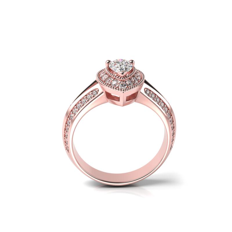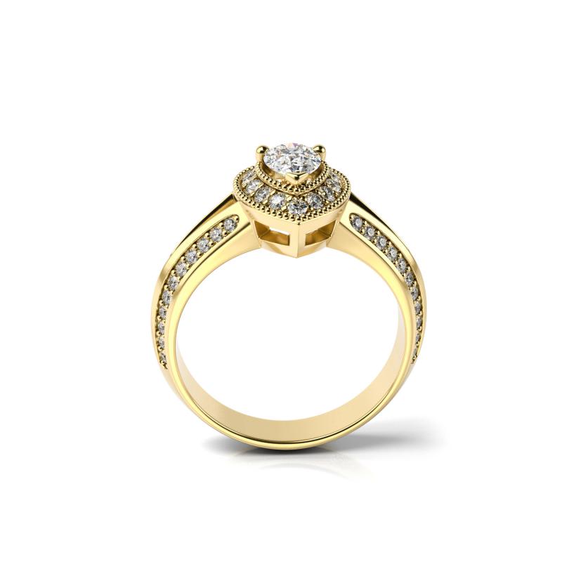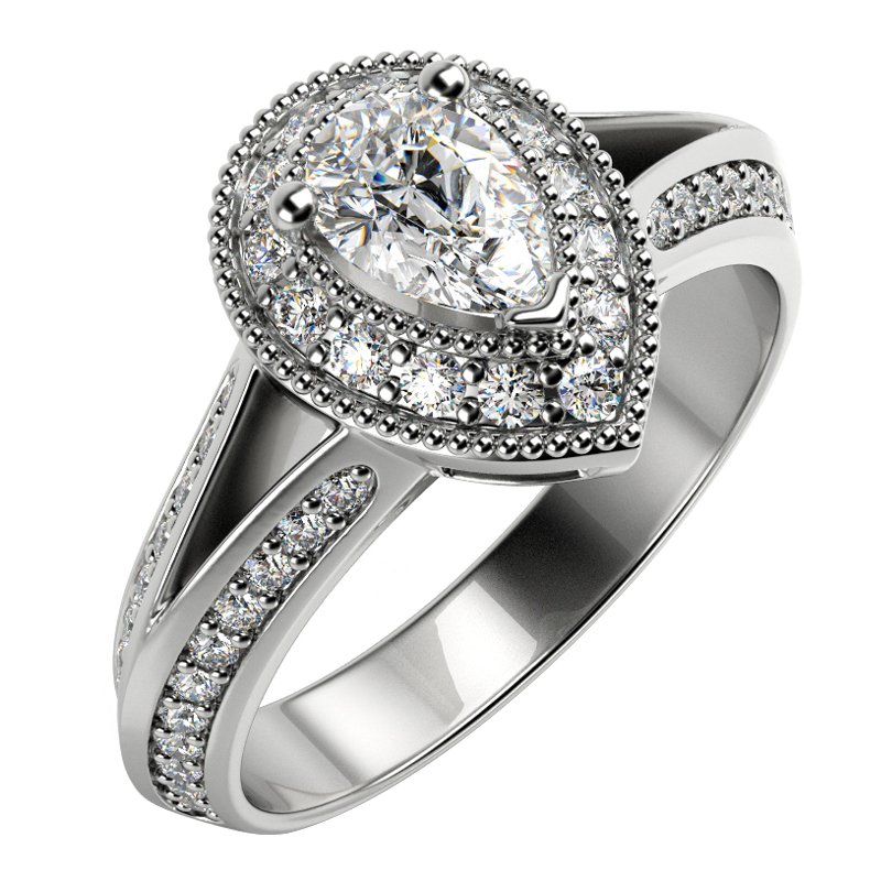 • ein ovaler Diamant ist in ein Halo aus Diamanten eingefasst und liegt auf einer diamantenbesetzten Ringschiene