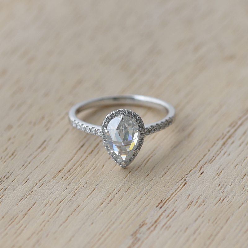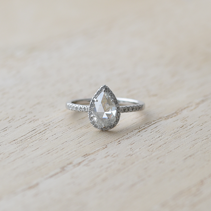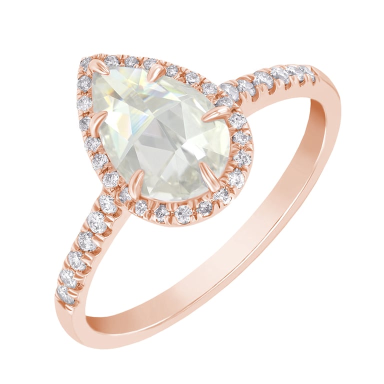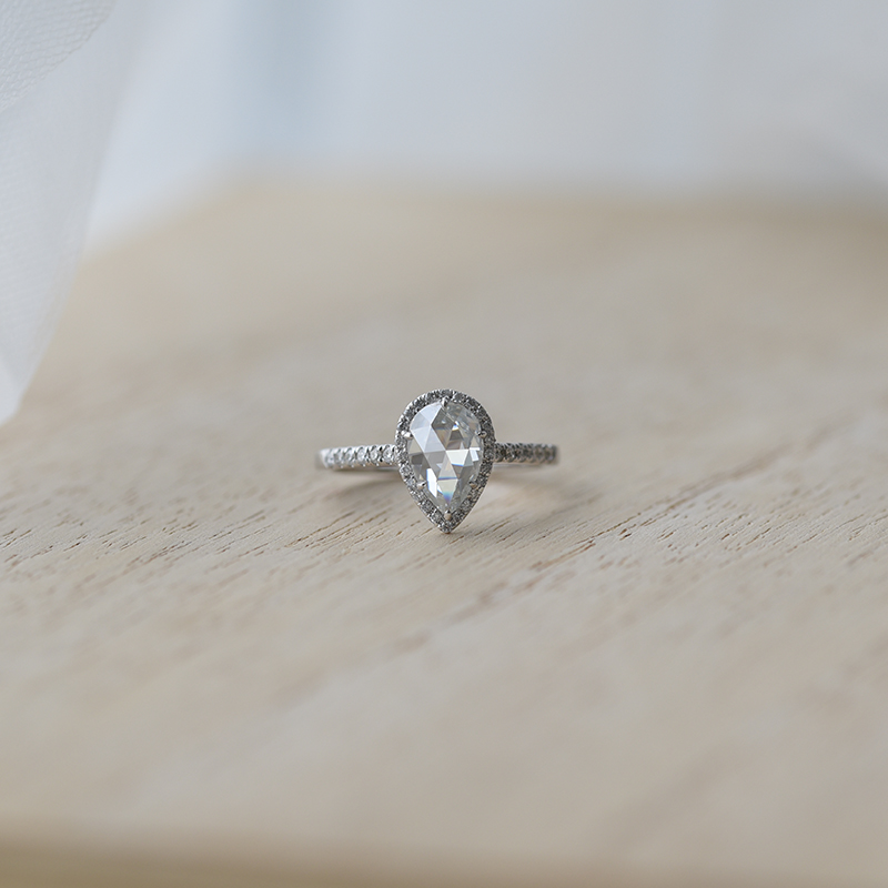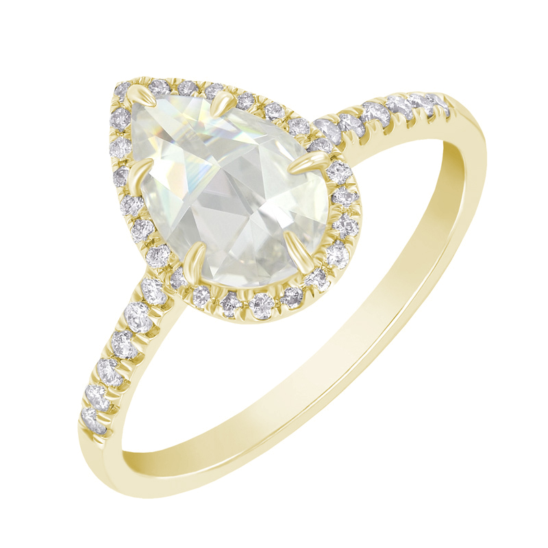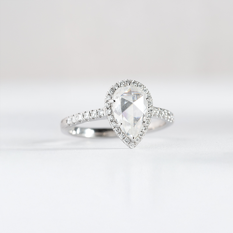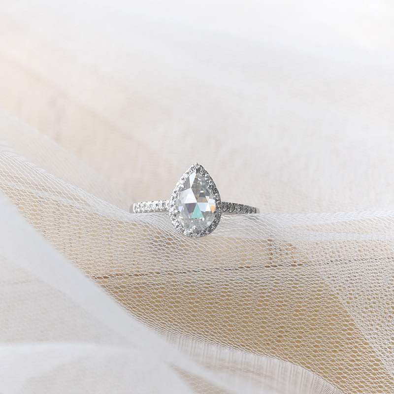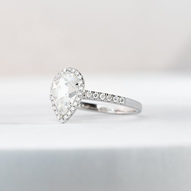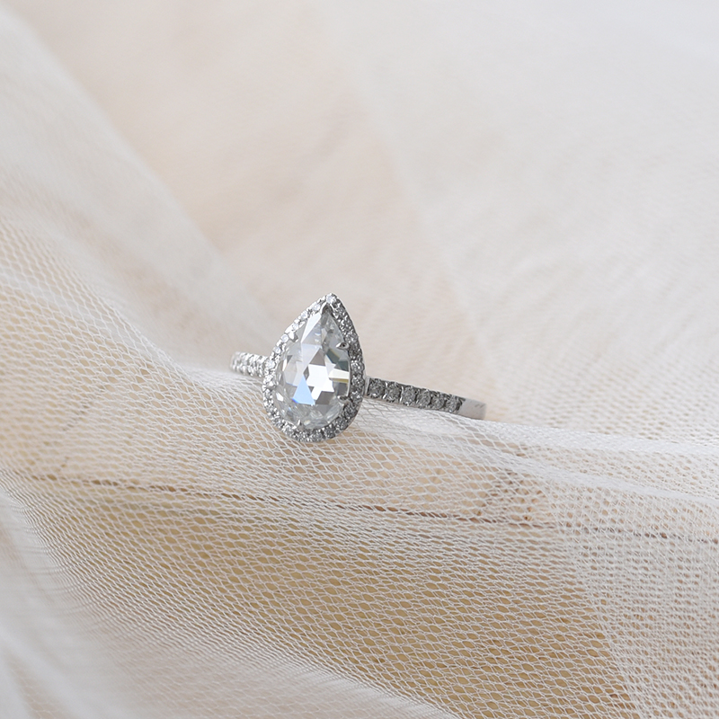 • dieser Verlobungsring mit einem birnenförmigen, zentralen Moissanit und seitlichen lab-grown Diamanten ist Ihr Begleiter auf dem Weg zur endlosen Liebe