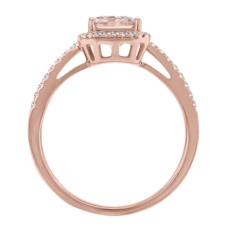 • ein klassisch anmutender Verlobungsring mit einem rechteckigen zartrosa Morganit umgeben von einem Halo mit Diamanten
