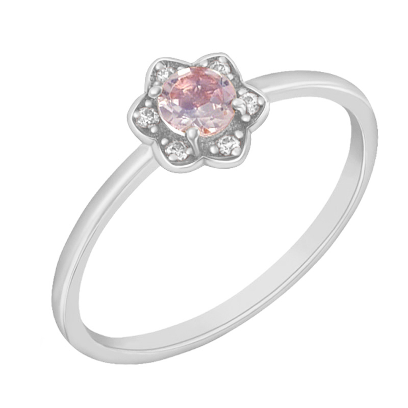 • der pastellrosa Morganit wird von sechs glänzenden Moissaniten eingerahmt