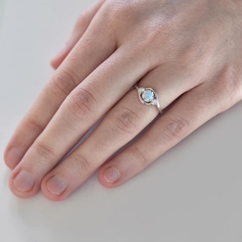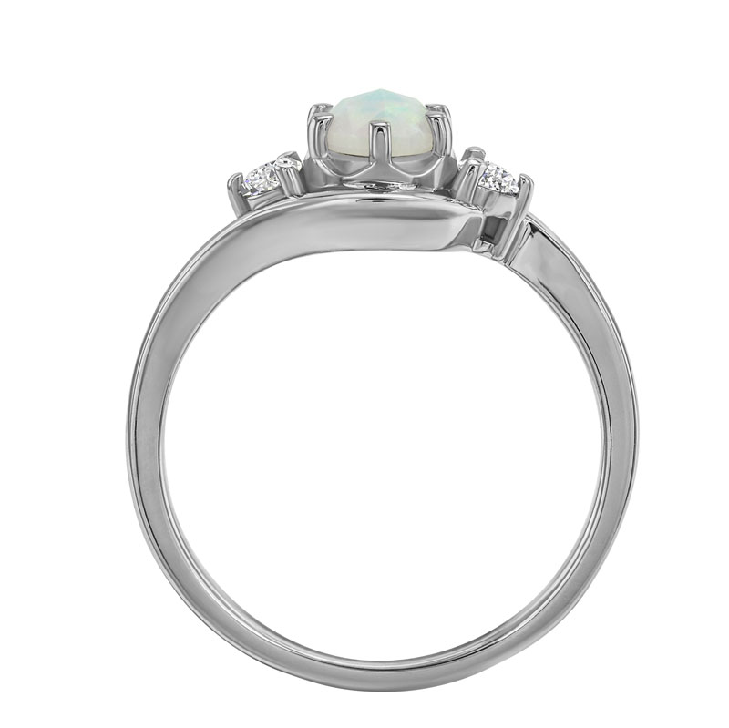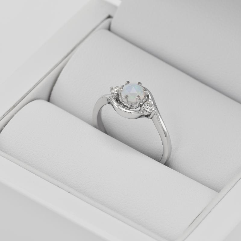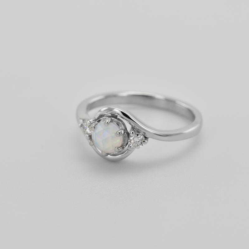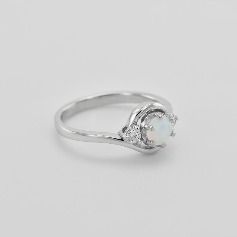 • der Verlobungsring ist mit einem zentralen Opal besetzt, der von zwei seitlichen Diamanten geschmückt wird