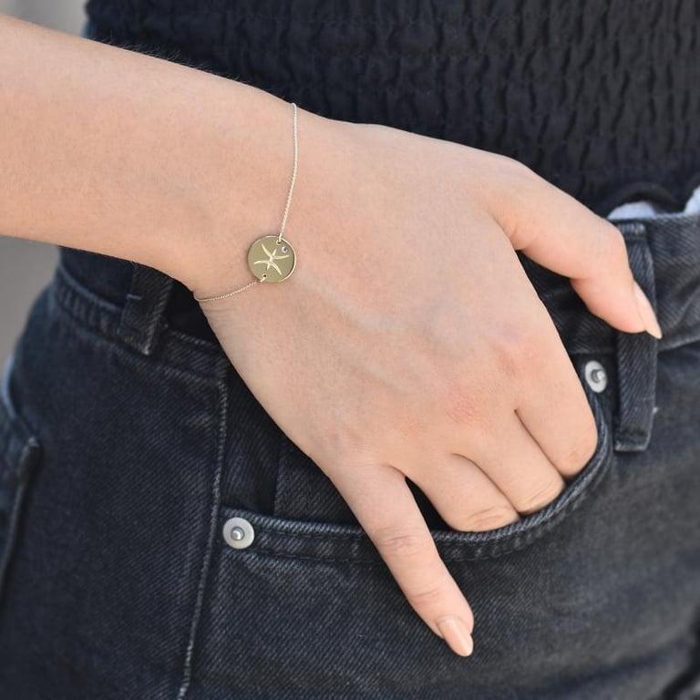 • Fische sind auch ruhig und charmant, ebenso wie der lila Amethyst, der dieses goldene Armband als Geburtsstein schmückt