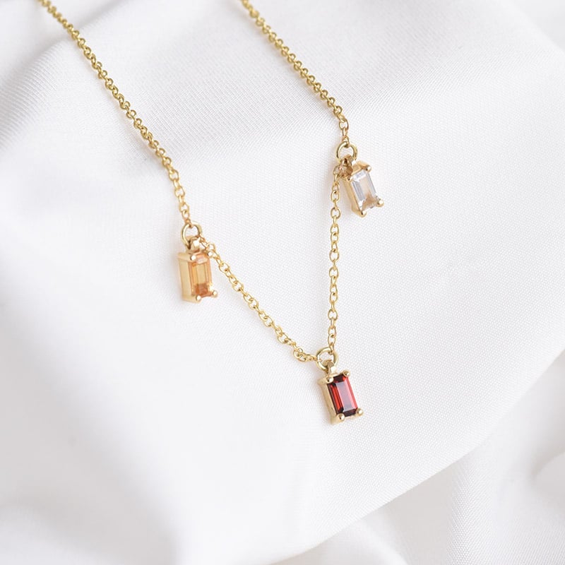 • eine verspielte Kombination von gelbem Citrin, rotem Granat und weißem Saphir