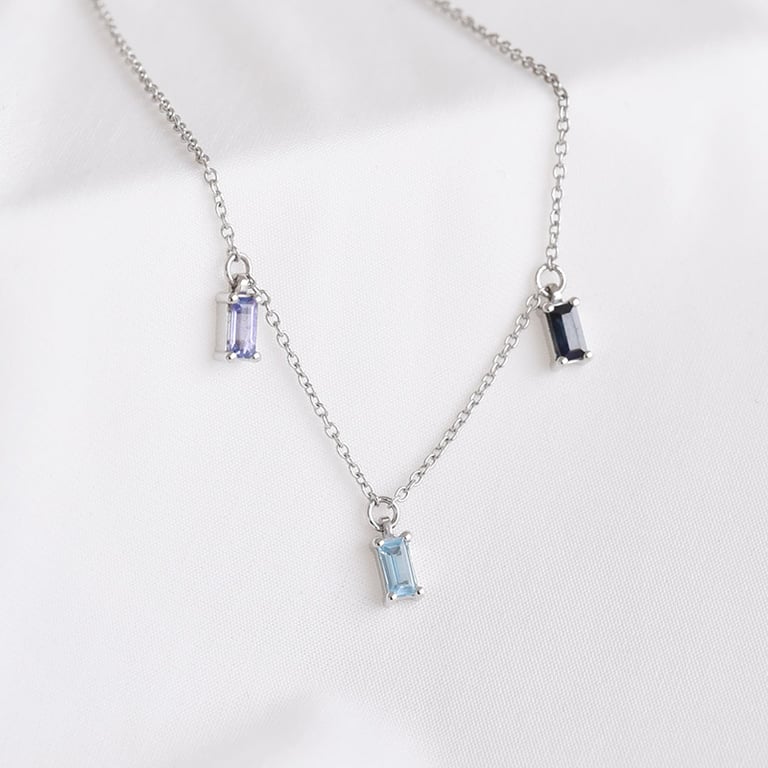 • ein weißer Saphir, ein blauer Topas und ein violetter Tansanit kreiieren eine außergewöhnliche Farbkombination