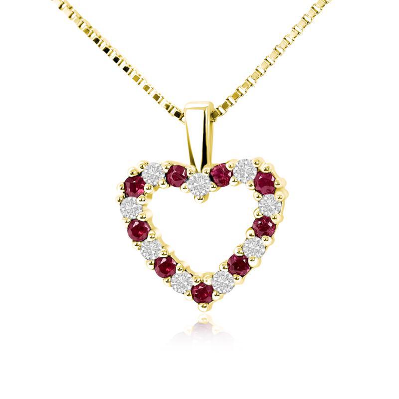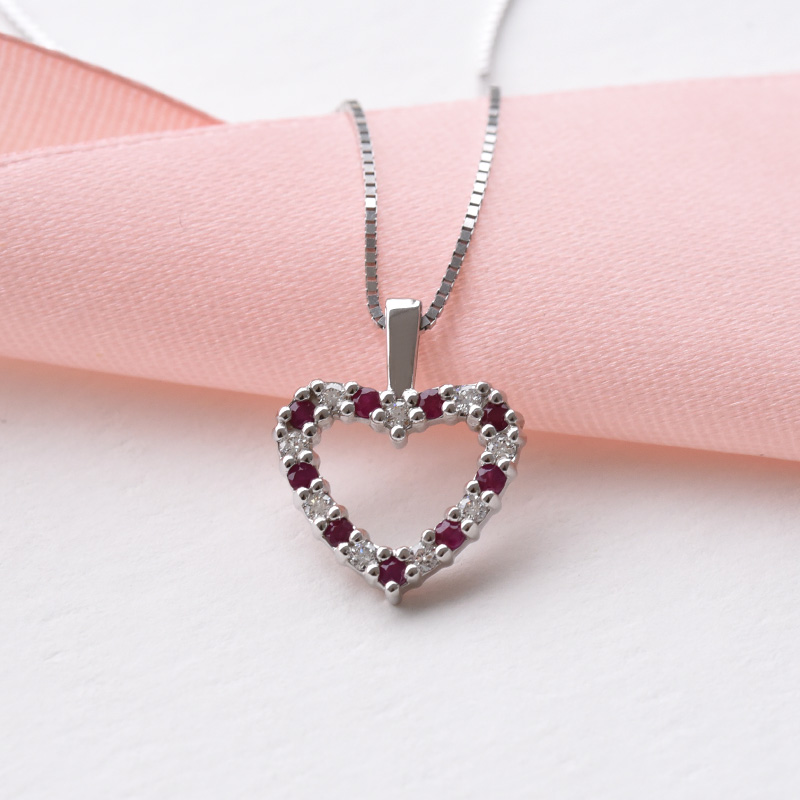 • der Anhänger ist abwechselnd mit runden Diamanten und Rubinen besetzt, die um die Wette strahlen