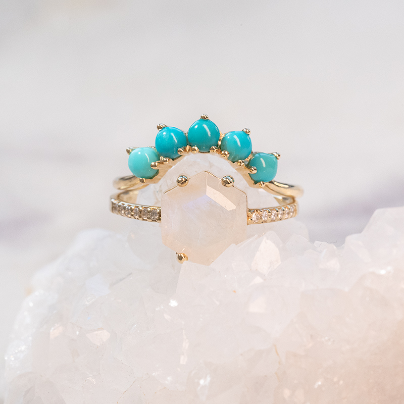 • der Mondstein in Hexagon-Form ergänzt die 5 runden Türkise perfekt