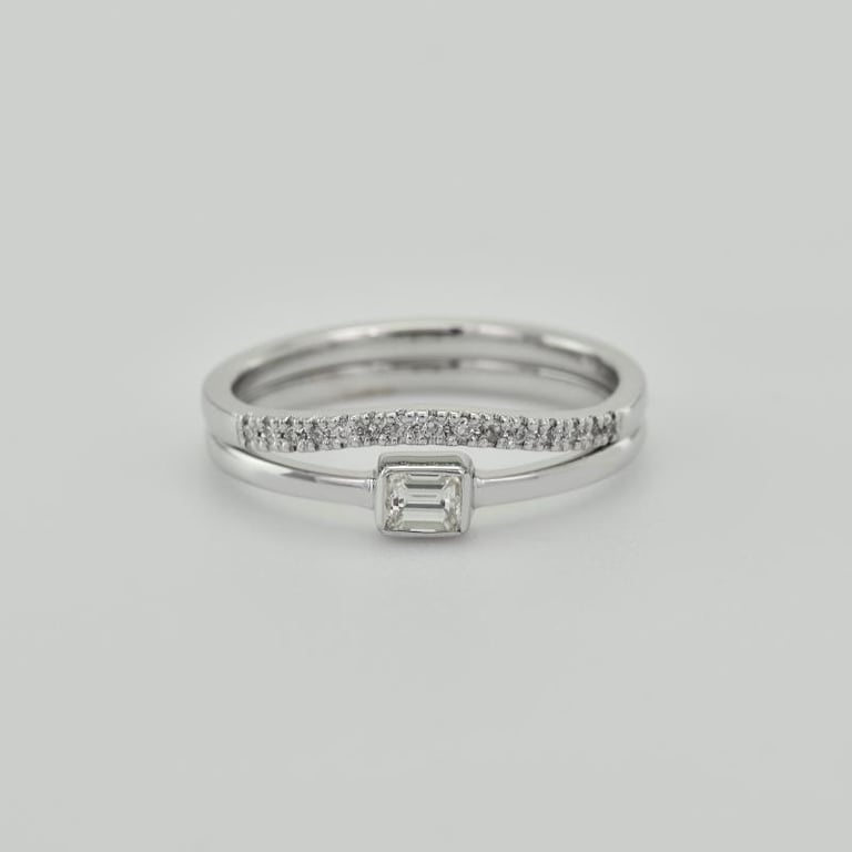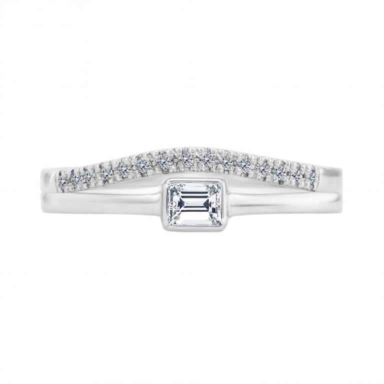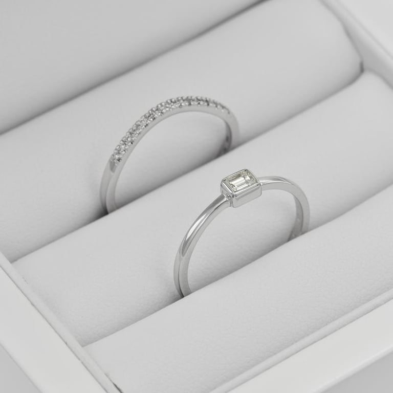 • der Verlobungsring ist mit einem Diamanten im Smaragdschliff besetzt und der Ehering mit fünfzehn Diamanten