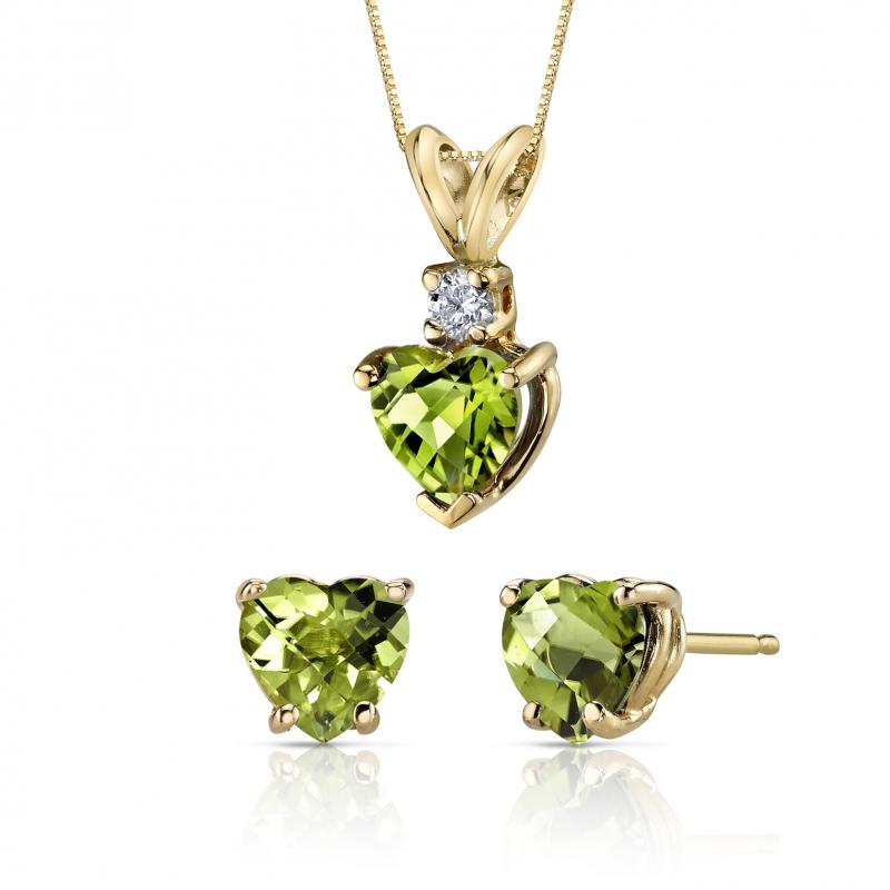 • das romantische Goldset hat grasgrüne Olivinherzen und einen Diamanten im Mittelpunkt