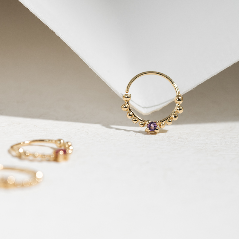 • in Form eines Rings, verziert mit einem natürlichen lila Amethyst und Goldkügelchen