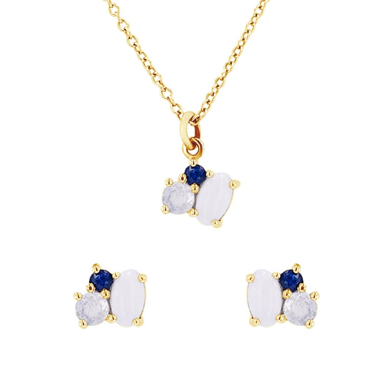 • dezentes goldenes Set aus Ohrsteckern und Anhänger in weißen und blauen Farbtönen