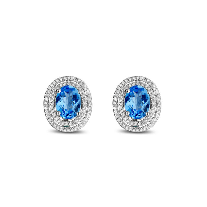 • große blaue Topase und Diamanten in einem doppelten Halo strahlen hier in Ohrsteckern um die Wette